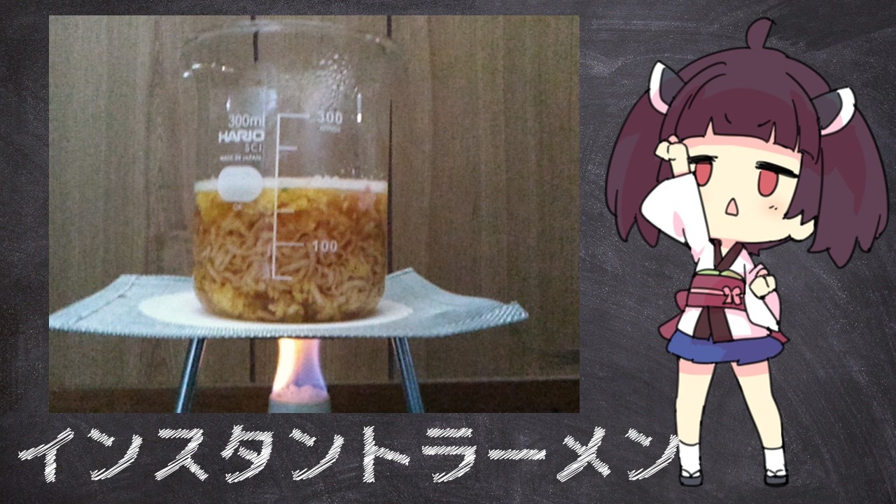 ※ 実験器具で料理をする際は必ず“実験に使っていないもの”を使いましょう<br> <br>料理が背景の解説動画<br>何らなら料理していない解説動画<br> <br>こんなんでも料理は好きですよ<br>ついでに解説も出来るのが素晴らしい<br> <br><a href="https://www.nicovideo.jp/mylist/71030384" target="_blank" rel="noopener">mylist/71030384</a> >次:<a href="https://www.nicovideo.jp/watch/sm38736540" class="watch">sm38736540</a><br> <br>投稿者の他の動画<br>化学 <a href="https://www.nicovideo.jp/mylist/70539607" target="_blank" rel="noopener">mylist/70539607</a><br>生化学 <a href="https://www.nicovideo.jp/mylist/70970603" target="_blank" rel="noopener">mylist/70970603</a><br>物理史 <a href="https://www.nicovideo.jp/watch/sm37438860" class="watch">sm37438860</a><br> <br>youtube<br><a href="https://youtu.be/ABlSDXIz5-w" target="_blank" rel="noopener nofollow">https://youtu.be/ABlSDXIz5-w</a><br><br>・試料<br>日清食品株式会社,“お椀で食べるチキンラーメン(即席袋めん)”<br>・参考文献<br>R.S.BECKE,W.E.WENTWORTH,著,木下實 訳,“ベッカー 一般化学(上・下)”,東京化学同人(1983).<br>玉虫伶太,井上祥平,梅澤喜夫,小谷正博,鈴木紘一,務台潔,<br>“エッセンシャル 化学辞典” ,東京化学同人(1999).<br>吉盛清之,“新しい常用国語 ことわざ・慣用句・四字熟語辞典” ,教育図書 学参部(2003).<br>・使用ソフト<br>“VOICEROID+ 東北きりたんEX”,株式会社AHS<br>AviUtlのお部屋,“AviUtl”(x264guiEx 他)<br>・使用画像<br>たぶちさんち,“東北きりたん立ち絵素材”(<a href="https://seiga.nicovideo.jp/seiga/im7029628)." target="_blank" rel="noopener nofollow">https://seiga.nicovideo.jp/seiga/im7029628).</a><br>ペテン師,“何かに似てる動きをするボイロ娘立ち絵”(<a href="https://seiga.nicovideo.jp/seiga/im7847919)." target="_blank" rel="noopener nofollow">https://seiga.nicovideo.jp/seiga/im7847919).</a><br>かみち,“SD東北きりたん立ち絵2018”(<a href="https://seiga.nicovideo.jp/seiga/im8167457)." target="_blank" rel="noopener nofollow">https://seiga.nicovideo.jp/seiga/im8167457).</a><br>Pixabay,(<a href="https://pixabay.com/ja/" target="_blank" rel="noopener nofollow">https://pixabay.com/ja/</a> ).<br>・使用音楽<br>鷹尾まさき,“わくわくクッキングタイム的なBGM”(<a href="https://commons.nicovideo.jp/material/nc132272)." target="_blank" rel="noopener nofollow">https://commons.nicovideo.jp/material/nc132272).</a><br>・使用フォント<br>(c) FLOP DESIGN,ラノベPOPv2<br>nippori30,“【無料版】全部ウエイト(太さ) ざっくりゴシック”.<br>
