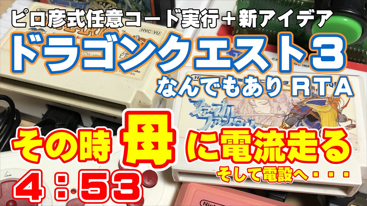 ノーホットプレートチャートです。MMCショート技+任意コード実行+デュアル互換機チャート<br>(「<strong>いいね!</strong>」ボタンを押すと、MMCショート技 最新テクニックがわかります)<br><br>ここまでくると少し罪悪感を感じますが、これが許可されているルール上の遊びと思ってください<br>冒険の書作成から大魔王を倒したことがわかる文章が表示されるまでを計測するルールです。<br>コミュ:<a href="https://live2.nicovideo.jp/watch/co1935425" target="_blank" rel="noopener nofollow">https://live2.nicovideo.jp/watch/co1935425</a> Twitter:@Hitsheegame <br><br>ピロ彦さんが3/27に発表しためちゃくちゃヤバいチャート:<a href="https://t.co/T90U4q3QEQ" target="_blank" rel="noopener nofollow">https://t.co/T90U4q3QEQ</a><br>電源バグとカセット差し替えによる任意コード実行+本体複数台使用の新チャートを使用<br>MMCの特定ピンをショートさせることで初期イベント飛ばしができ、大幅な更新ができるようになりました。<br>当日はピロ彦さんによる完全サポート体制でチャート詳細のアドバイスをいただきました。<br><br>FCTECH+ を使用。カートリッジはザラAと呼ばれる前期バージョンとしては後半に販売されたロットを使用しています。<br><br>特性上本体故障のリスクなどは自己責任でお試しください。今のところは一度も壊れてはいないです<br><br>広告のお礼<br>.. さん、gattaiken さん、märchenzitrus30 さん、nega81 さん、punipuni さん、sesiru さん、t28 さん、ta13n0 さん、tatibana さん、こくまろみるく さん、はいいろ さん、イカレ漢 さん、オルゴ・デミーラ さん、ザナドゥ さん、スーパーフェニックス さん、デスダャッカル さん、名無しex さん、幹部のペリーコロ さん、明田蒼憲 さん、時の君 さん<br>広告ありがとうございます!<br><br>前回動画<br>⇒ <a href="https://www.nicovideo.jp/watch/sm38565307" class="watch">sm38565307</a><br><br>別カテゴリ 電源バグ ホットプレート ゾーマ討伐 焼肉チャート<br>⇒ <a href="https://www.nicovideo.jp/watch/sm38073899" class="watch">sm38073899</a><br><br>この動画で利用している株式会社スクウェア・エニックスを代表とする共同著作者が権利を所有する著作物及びスギヤマ工房有限会社が権利を所有する楽曲の転載・配布は禁止いたします。<br>© 1988 ARMOR PROJECT/BIRD STUDIO/SPIKE CHUNSOFT/SQUARE ENIX All Rights Reserved.<br>© SUGIYAMA KOBO