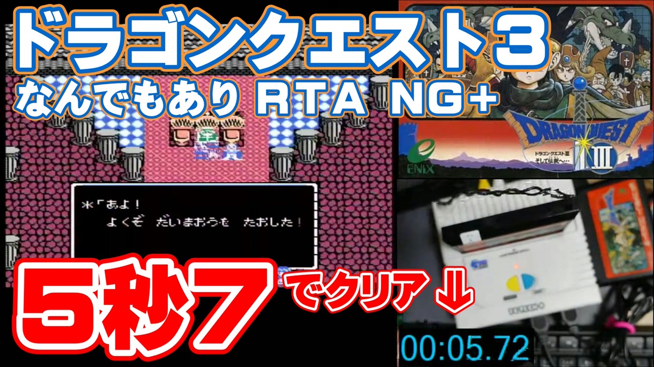 ニューゲームプラスの別カテゴリ扱いの記録です。<br>(「<strong>いいね!</strong>」ボタンを押すと、ピロ彦さんによるDQ3の新チャート発表予定日が分かります)<br><br>もう罪悪感しかありませんが、これが許可されているルール上の遊びと思ってください<br>冒険の書作成から大魔王を倒したことがわかる文章が表示されるまでを計測するルールです。<br><br>冒険の書0番相当のアドレスに各種フラグが格納されておりセーブフラグやゾーマ撃破フラグなど様々なものがあります。<br>冒険の書を削除しても該当フラグが消去されるイベントを経由しないとそのフラグは消えません。<br><br>新電撃ボタン技でフラグ消去をスキップして再開できるため即時エンディングになる仕組みです。<br>技の特性上NG+(ニューゲームプラス)としています<br><br>FCTECH+ を使用。カートリッジはザラAと呼ばれる前期バージョンとしては後半に販売されたロットを使用しています。<br><br>特性上本体故障のリスクなどは自己責任でお試しください。今のところは一度も壊れてはいないです<br><br>何でもありRTAの基本ルールは以下の通り<br>DQ3電源ON/OFFあり、カセット差し替えあり、任意コード実行、MMCをショートさせたりなんでもあり<br>事前に作成した改造データなどへの差し替えは禁止 <br>冒険の書作成から大魔王を倒したことがわかる文章が表示されるまでを計測するルールです。<br><br>別カテゴリ 任意コード実行チャート<br>⇒ <a href="https://www.nicovideo.jp/watch/sm38724632" class="watch">sm38724632</a><br><br>別カテゴリ 電源バグ ホットプレート ゾーマ討伐 焼肉チャート<br>⇒ <a href="https://www.nicovideo.jp/watch/sm38073899" class="watch">sm38073899</a><br><br>この動画で利用している株式会社スクウェア・エニックスを代表とする共同著作者が権利を所有する著作物及びスギヤマ工房有限会社が権利を所有する楽曲の転載・配布は禁止いたします。<br>© 1988 ARMOR PROJECT/BIRD STUDIO/SPIKE CHUNSOFT/SQUARE ENIX All Rights Reserved.<br>© SUGIYAMA KOBO