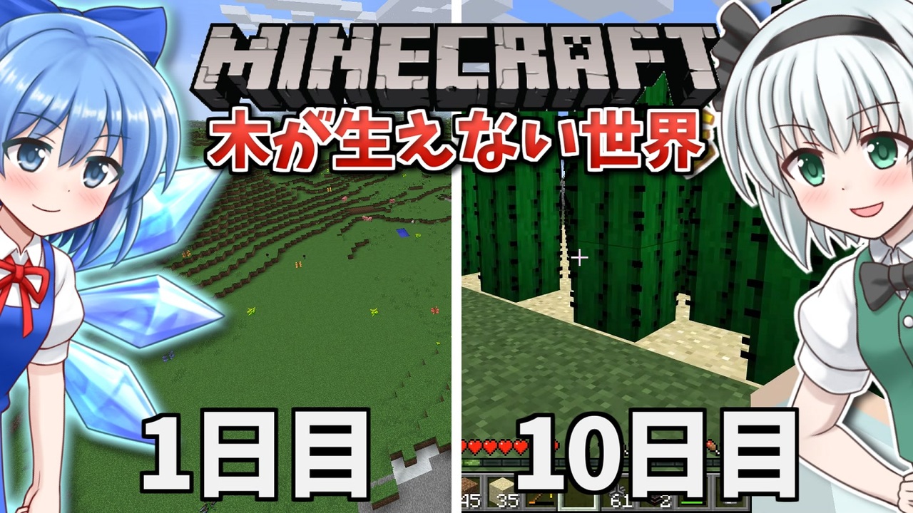 なんかYoutubeで話題になってるらしい、マイクラの100日間を記録する「100days」という企画をやってみることにします。<br><br><span style="font-size: 18px;"><strong>20日目ぐらいで気づいたけど、これ縛りとしても企画としても成り立ってないじゃん!</strong></span><br><br>さすがに打ち切りにはしたくないので最後まで続けますが、期待はしないでください…<br><br>=============木が生えない世界で100日間サバイバル!===============<br>Minecraft Ver1.12.2<br>立ち絵:ふにちか 様<br>霊夢: <a href="https://seiga.nicovideo.jp/seiga/im9999918" target="_blank" rel="noopener">im9999918</a> 魔理沙: <a href="https://seiga.nicovideo.jp/seiga/im10034978" target="_blank" rel="noopener">im10034978</a> 妖夢: <a href="https://seiga.nicovideo.jp/seiga/im10525425" target="_blank" rel="noopener">im10525425</a> チルノ: <a href="https://seiga.nicovideo.jp/seiga/im10616905" target="_blank" rel="noopener">im10616905</a><br>※立ち絵の使い方(使い方を直接作者様に聞くのはご遠慮ください)<br>①<a href="https://www.nicovideo.jp/watch/sm36965211" class="watch">sm36965211</a> ②<a href="https://www.nicovideo.jp/watch/sm36965343" class="watch">sm36965343</a><br>