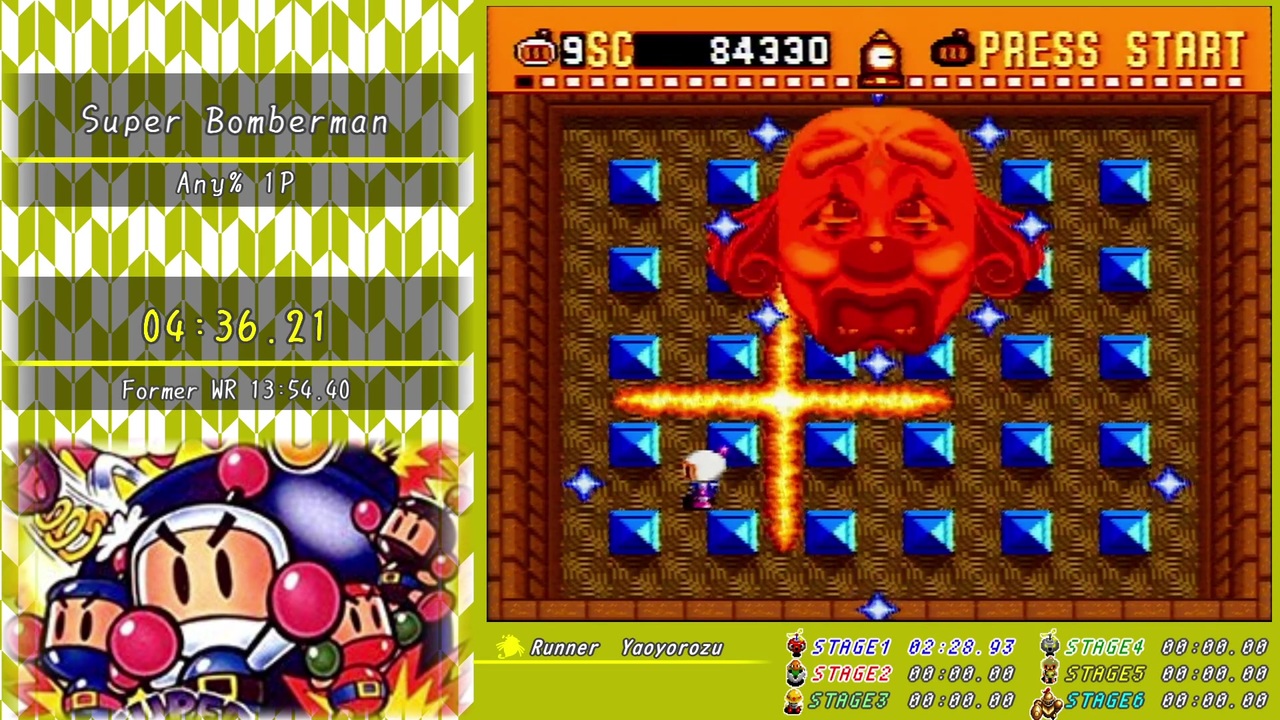 今回割とまともな事書こうと思います。<br>チャート変更は特になし。細かいところを詰めただけです。<br><br>最近ボンバーマンRTA界隈が海外で賑わっていてとても嬉しく思います。<br>約2年前は僕1人だった13分台も今では4人に増えています。自分の好きなゲームでここまで熱くなっているさまを見るのは、国が違えど嬉しいものがあります。ただ、キッカケになった質素がいいさんの記録が未だに6位なのがなんか…エモい。<br><br>ゆっくり・ポイロ付解説動画ですが、こちらはもしも、13分50秒を切れたらまた作ろうと思います。おそらくそれが人類の限界だと思います。まだできるかどうかはわからない次元ですが。<br><br>また、最近スーパーボンバーマンRTAトーナメントも開かれ、投稿日時点で世界2位の方に打ち勝ち、2位以上が確定しています。名実ともに「世界で一番スーパーボンバーマンを早くクリアできる人間」になるまで、もうすぐです。頑張ります。結果は5月末には決まるんじゃないかな。<br><br><span style="color: #ff0000; font-size: 24px;"><strong>2021.5.20 超えられてた。でも録画ミスだったらしい。でも実質超えられてるな</strong></span><br><br>世界順位はここから閲覧できます↓<br><a href="https://www.speedrun.com/super_bomberman" target="_blank" rel="noopener nofollow">https://www.speedrun.com/super_bomberman</a><br><br>録画ミスで生放送の読み上げが入っちゃってます。ごめんなサイレント<br>トーナメントの放送だったり馬がいたりしますが、<a href="#" class="seekTime" data-seekTime="19:17" onclick="seekNicoPlayer('#19:17'); return false;">#19:17</a>でしっかり世界記録更新してます(13:54になってますが、その後のAviutl検証でしっかり13:53なことを確認済)<br>アーカイブ→<a href="https://www.youtube.com/watch?v=bl4-PpaWOYg&t=4210s" target="_blank" rel="noopener nofollow">https://www.youtube.com/watch?v=bl4-PpaWOYg&t=4210s</a><br><br><span style="color: #ff0000;">Youtubeチャンネル開設しました!基本的には生放送のアーカイブ置き場です。</span><br><a href="https://www.youtube.com/channel/UCPUsX1jLhCUuyNqfWgYdH0w" target="_blank" rel="noopener nofollow">https://www.youtube.com/channel/UCPUsX1jLhCUuyNqfWgYdH0w</a><br><br>ボンバーマンRTA → <a href="https://www.nicovideo.jp/mylist/59356396" target="_blank" rel="noopener">mylist/59356396</a><br>その他投稿シリーズPart1まとめ → <a href="https://www.nicovideo.jp/mylist/66405907" target="_blank" rel="noopener">mylist/66405907</a><br><br>Twitter → <a href="https://twitter.com/YaoYorozu_8mi" target="_blank" rel="noopener nofollow">https://twitter.com/YaoYorozu_8mi</a><br>コミュニティ → co3843553