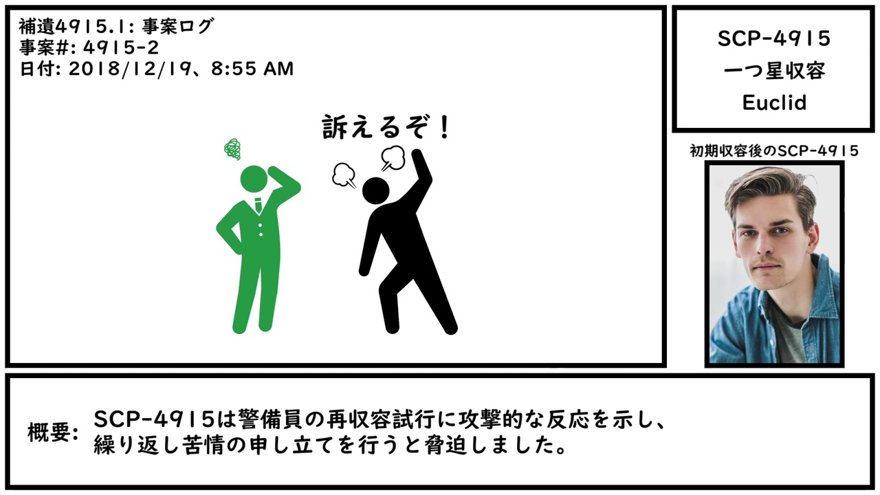 評価: ★☆☆☆☆<br>最悪でした。部屋は狭く窓もありません。<br>スタッフの対応も悪く、暴言まで吐かれました。<br>テーマに忠実なのはわかりますが、客の要望に一切答えないのはどうかと思います。<br>もう二度と来ません。<br><br>本家記事 <a href="http://scp-wiki.wikidot.com/scp-4915" target="_blank" rel="noopener nofollow">http://scp-wiki.wikidot.com/scp-4915</a><br>翻訳記事 <a href="http://scp-jp.wikidot.com/scp-4915" target="_blank" rel="noopener nofollow">http://scp-jp.wikidot.com/scp-4915</a><br>作者 AlanDaris(アカウント削除)<br>SCP財団 <a href="http://scp-jp.wikidot.com" target="_blank" rel="noopener nofollow">http://scp-jp.wikidot.com</a><br>過去の動画はこちら <a href="https://www.nicovideo.jp/mylist/67620202" target="_blank" rel="noopener">mylist/67620202</a><br>CC-BY-SA 3.0