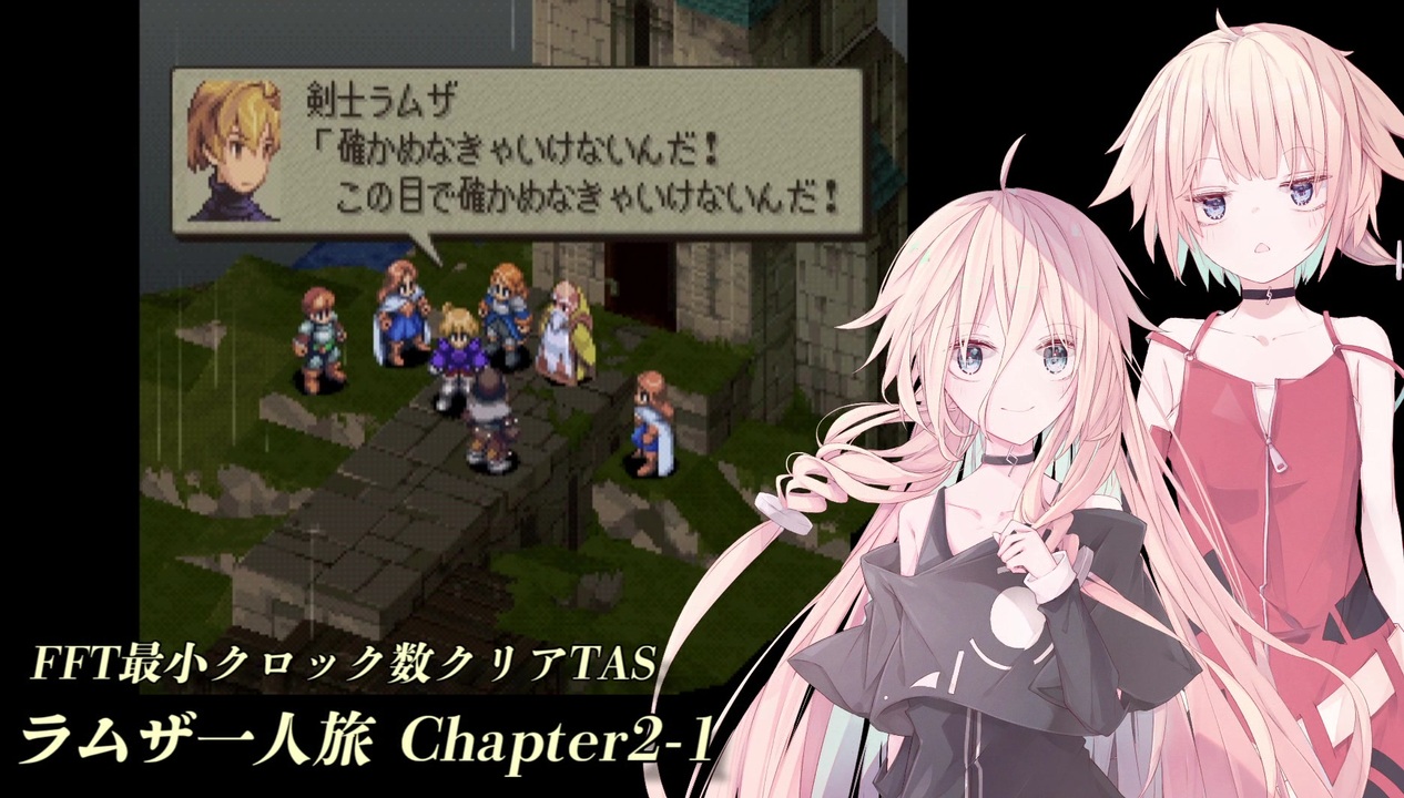 チャプター2に入りました。徐々にこの制限プレイの厳しさが牙を剝いてきます。<br>ちなみにあの森に行くまで、割と本気でおまけ気分でプレイしてました。<br>ものの見事に、目論見が粉砕されましたが……。<br><br>--<br>PS版FFTのシナリオを最小クロック・ラムザ一人でクリアするTAS動画です。<br>合成音声による解説がありますので、苦手な方はご注意ください。<br><br>【プレイ条件】<br>1. 戦闘はシナリオ順に最小クロックでクリア<br>2. ラムザ一人旅(ラムザ一人のみ出撃、途中の味方加入禁止)<br> ※ シナリオ上、強制参加となるゲストユニットは例外<br>3. バグ(JPカンストバグ等)利用禁止<br>4. データセーブおよびロード禁止<br><br>【プレイ環境】<br>エミュレータ: BizHawk 2.3.1<br>最終キー入力: 75,813,586 F(355:10:29.209)<br>追記回数: 647,200<br><br>【プレイ資料やキームービーファイル等】<br><a href="https://ux.getuploader.com/fftminclock/" target="_blank" rel="noopener nofollow">https://ux.getuploader.com/fftminclock/</a><br>pass: fft-min-clock<br><br>【お借りした素材】<br>◆IA -ARIA ON THE PLANETES- ver0.7 / 桧野 拓海 様 (<a href="https://seiga.nicovideo.jp/seiga/im10561893" target="_blank" rel="noopener">im10561893</a>)<br>◆ OИE -ARIA ON THE PLANETES- 立ち絵素材2 / 桧野 拓海 様 (<a href="https://seiga.nicovideo.jp/seiga/im10560014" target="_blank" rel="noopener">im10560014</a>)<br>◆ ニコニ・コモンズ<br><br><a href="https://www.nicovideo.jp/watch/sm38734975" class="watch">sm38734975</a> < 前:次 > <a href="https://www.nicovideo.jp/watch/sm38802900" class="watch">sm38802900</a><br>マイリスト:<a href="https://www.nicovideo.jp/mylist/70913527" target="_blank" rel="noopener">mylist/70913527</a><br>進捗報告:<a href="https://twitter.com/spherewind1" target="_blank" rel="noopener nofollow">https://twitter.com/spherewind1</a>