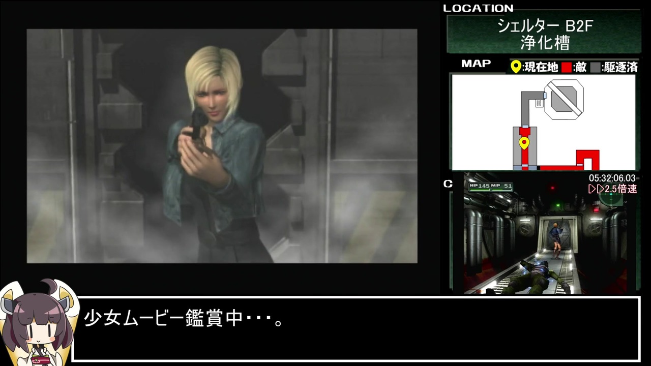 お待たせしました。投稿遅れて申し訳ナス!<br>雑談はたぶん今回のが最後になります。<br><br>テント着~最終殲滅途中まで<br><br>※追記QA※<br>Q1:なんでテントでヒドラ補充せずに兵器庫で補充してるの?<br>A1:そうだよ(池沼)<br> ついでに言うと今後ヒドラは使わないので補充する意味もないです(手遅れ)<br><br>Q2:シェルターからドライフィールド行く道って通れなくなってるの?<br>A2:シェルターのエレベーターホールのエレベーターが停止しているので、<br> B3より下に行くことができなくなっています。(シェルター・DF間の道はB4のみ)<br><br>※追記2※<br>・ガンブレードのエフェクトについて<br>はえー、FF8のオマージュなんすねぇ、教えていただきありがとうございます。<br>FF8はカッチャマがやってたのを横で見てたくらいでプレイはしてませんでした・・・(小声)<br><br><a href="https://www.nicovideo.jp/watch/sm38660075" class="watch">sm38660075</a>←前|<a href="https://www.nicovideo.jp/mylist/70540439" target="_blank" rel="noopener">mylist/70540439</a>|次→<a href="https://www.nicovideo.jp/watch/sm38812087" class="watch">sm38812087</a><br /><br><strong><u>▼環境</u></strong><br>・PS2実機、連射機なし、高速読み込みなし<br><br><strong><u>▼レギュレーション</u></strong><br>・計測期間:「デッドリーモード」選択~ラスボスに最後の一撃を与えた瞬間<br>・難易度:デッドリーモード<br>・最終セーブポイントで「駆逐率100%」を確認する<br>・ジャベリンバグ使用禁止<br>・(最終的に駆逐率100%であれば)逃走可<br><br>お借りしたきりたん立ち絵→<a href="https://seiga.nicovideo.jp/seiga/im8645890" target="_blank" rel="noopener">im8645890</a><br><br>ついた→<a href="https://twitter.com/KemotooooN_RTA" target="_blank" rel="noopener nofollow">https://twitter.com/KemotooooN_RTA</a><br><br>広告者様紹介は最後にドバーッと行う予定です。