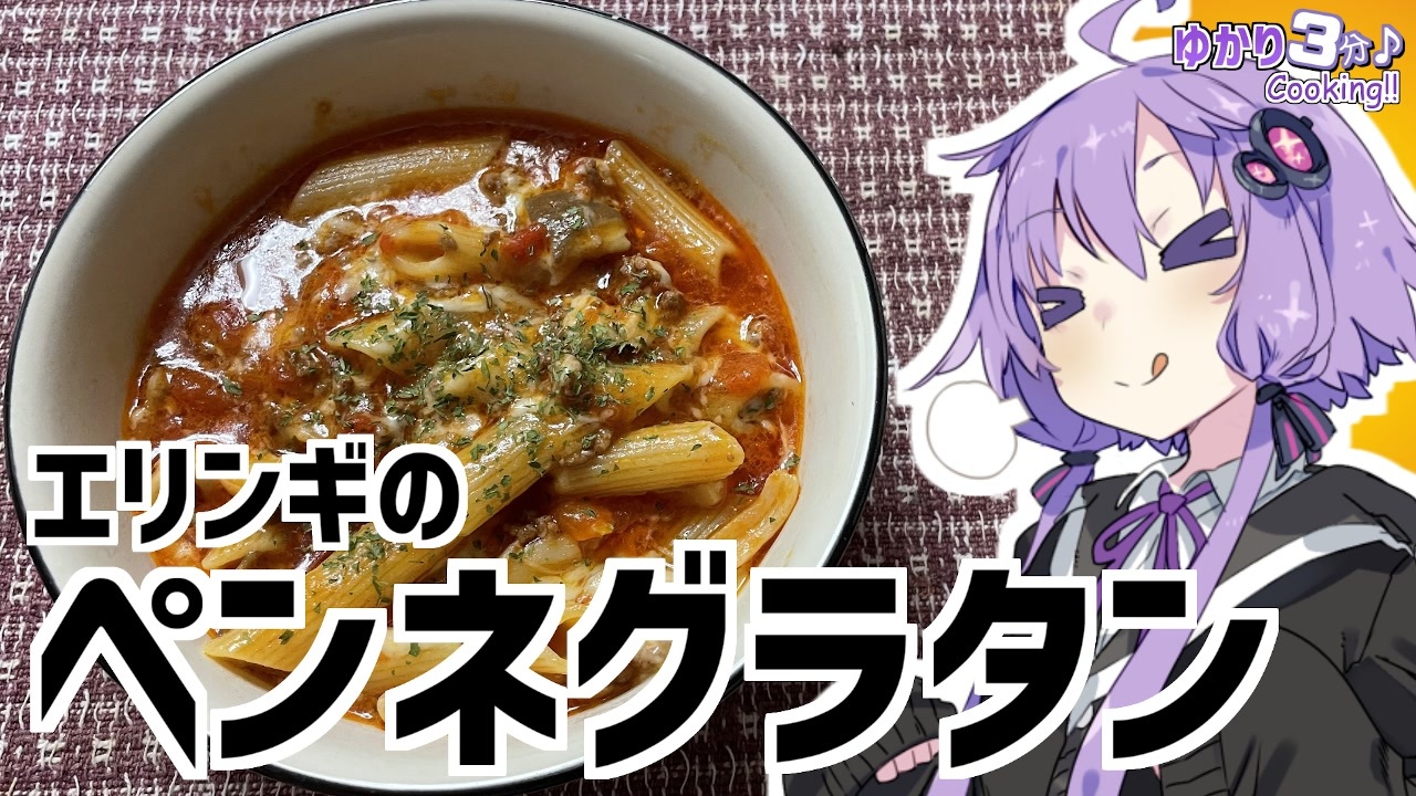 結月ゆかりを使用した料理動画です<br><br>ペンネグラタン作りました!<br>ペンネはこういう感じの料理と合いますね!<br><br>やらかしたガバについては『いいね!』を押して確認してくれよな!<br><br>今回使用した材料<br>合い挽き:150g ペンネ:100g<br>エリンギ:3本 とろけるチーズ:沢山<br>コンソメ:小さじ4 トマト缶:1つ<br><br>前回の豚キムチ:<a href="https://www.nicovideo.jp/watch/sm38760063" class="watch">sm38760063</a><br>お久しぶりのJK旅新作(旅行に行ったとは言ってない):<a href="https://www.nicovideo.jp/watch/sm38726550" class="watch">sm38726550</a><br><br>オススメのボイロ劇場<br>茜ちゃんと葵ちゃんの現代怪異占い:<a href="https://www.nicovideo.jp/watch/sm38263500" class="watch">sm38263500</a><br><br>ツイッター:<a href="https://twitter.com/mrt89244817" target="_blank" rel="noopener nofollow">https://twitter.com/mrt89244817</a>