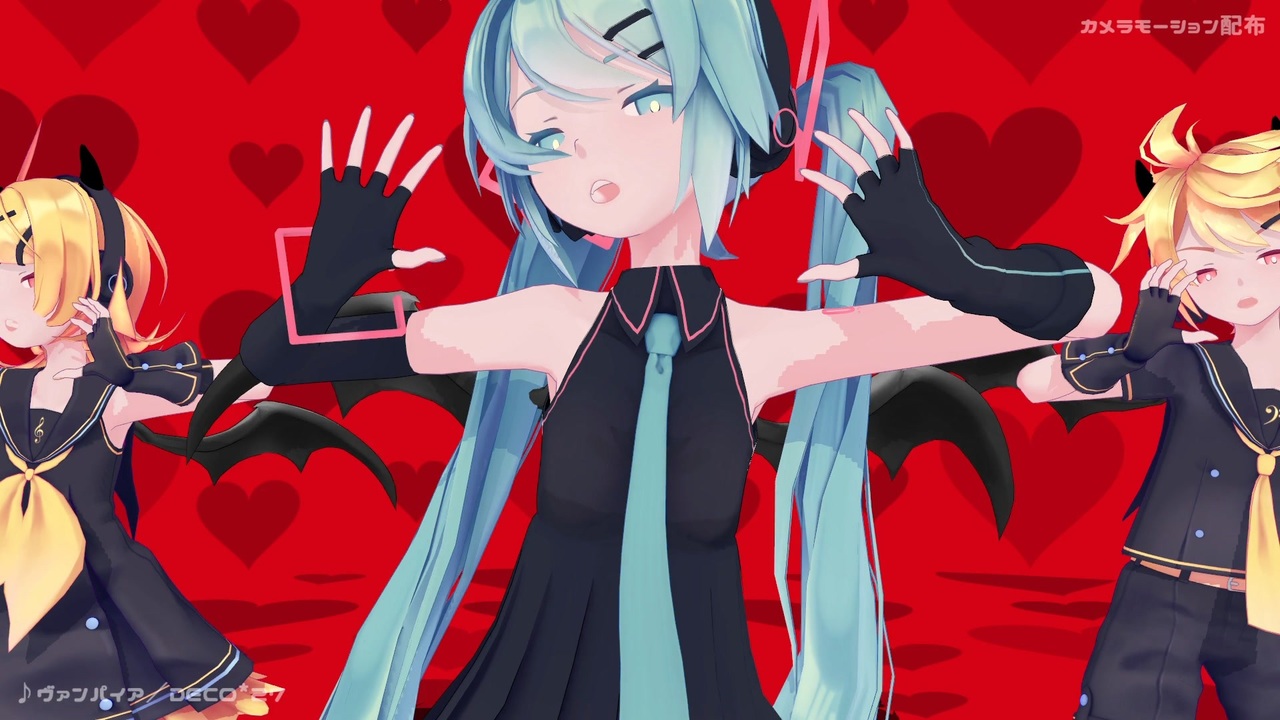 いいの?吸っちゃっていいの?<br>「もう無理もう無理」なんて 悪い子だね<br><br>づなうじさんが素敵なモーションを配布されましたので、カメラを付けてみました!<br>ヴァンパイアって事で、いつもの3人に悪魔の羽と角を付けてダークにするつもりが、<br>なんだか可愛くなってしまいました。こんな可愛い吸血鬼なら血を吸われてもいい?<br>ぺんたさんの可愛い振付で踊る、3人の可愛い吸血鬼のダンスをご覧あれ (≧▽≦)/<br><br>カメラモーション配布しています。<br>><a href="https://bowlroll.net/file/254676" target="_blank" rel="noopener nofollow">https://bowlroll.net/file/254676</a><br>解凍PWは、この説明文の最初のフレーズです。<br>※音源は本家楽曲のタイミングに合わせています。<br><br>ニコニコでカメラ使って頂きました!<br>><a href="https://commons.nicovideo.jp/works/sm38771568/tree/children" target="_blank" rel="noopener nofollow">https://commons.nicovideo.jp/works/sm38771568/tree/children</a><br>YouTubeでカメラ使って頂きました!<br>><a href="https://www.youtube.com/playlist?list=PLC_uSlhOor2ghZr9wI1SasJJfMaMyeAB5" target="_blank" rel="noopener nofollow">https://www.youtube.com/playlist?list=PLC_uSlhOor2ghZr9wI1SasJJfMaMyeAB5</a><br><br><strong>ミーネンロイマー様、ジェット炎様、桜田門瑞樹様、Naoki Yamakawa様、<br>無重力様、沈黙の人様、static様、ハクさん様、y-puppy様、ぎょぎょ様、<br>うにを様、ノン様、おにぎり様、ロングアイランド様、Deki-Hi様、くまち様、<br>づなうじ様、かさね1010様、れに様、nuxy様、もみもみ様、冴。様、<br>marudomarudo様、はるか@様、ウッチー☆様、ますたー様、pecora様、<br>しゃん子様、大和守KENN様、かーこんパンチ様、さにい様、lesser class様、<br>gunmer様、ハルカ様、Asashio様、くる~ん様、しゃん子様、samariri様、<br>p_philosophie様、かおりん@様、友翔様、ともぉッチ様、翔太様、<br>SNKSラーメン様、つむぎ@VRoid様、きょー様、Nom Bre様、sunafukin様、<br>氷砂糖様、広告ありがとうございます!</strong><br><span style="font-size: 10px;">ミー様の広告 いっぱいでカメラ作り まだ絶対いけるよ</span><br><br>楽曲:DECO*27様 <a href="https://www.nicovideo.jp/watch/sm38387707" class="watch">sm38387707</a><br>振付:足太ぺんた様 <a href="https://www.nicovideo.jp/watch/sm38424393" class="watch">sm38424393</a><br>モーション:づなうじ様 <a href="https://www.nicovideo.jp/watch/sm38704893" class="watch">sm38704893</a><br>リップ表情:ノン様<br>モデル:Sour暄様<br>アクセサリ:神吉様/ゆきち様<br>ステージ:ありさと様<br><br /><span style="color: #0000ff;">カメラモーション配布シリーズ</span>><a href="https://www.nicovideo.jp/series/24541" target="_blank" rel="noopener">series/24541</a><br>ブッとんでいけ!<a href="https://www.nicovideo.jp/watch/sm45781308" class="watch">sm45781308</a> 2025/12/30 配布開始 <span style="color: #ff0000;">New!!</span><br>YouTubeはこちら↓<br>><a href="https://www.youtube.com/playlist?list=PLC_uSlhOor2gzlT7JCXbwJGgxZ00QekiO" target="_blank" rel="noopener nofollow">https://www.youtube.com/playlist?list=PLC_uSlhOor2gzlT7JCXbwJGgxZ00QekiO</a><br><br><span style="color: #ff0000;"><strong>どりーみんチュチュ カメラ配布動画</strong></span><br><span style="color: #ff0000; font-size: 16px;"><strong>YouTubeにて78万再生突破 !!</strong></span><br>><a href="https://youtu.be/EG19VETMBqg" target="_blank" rel="noopener nofollow">https://youtu.be/EG19VETMBqg</a><br><br>カメラ使って頂きました最新情報はこちら!<br>><a href="https://x.com/eichan2222" target="_blank" rel="noopener nofollow">https://x.com/eichan2222</a>