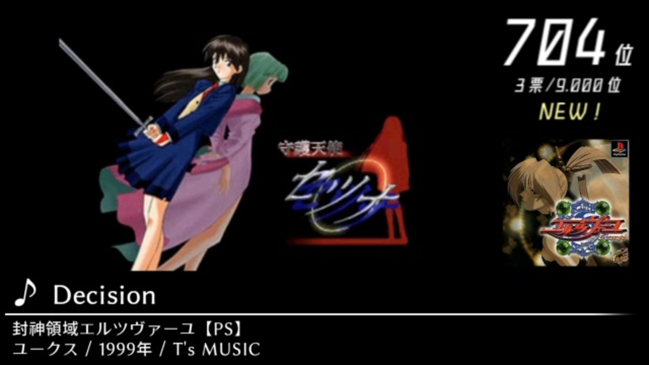 実際このゲーム、演出やキャラ付け等、あらゆる箇所で<br>TVアニメのそれを強く意識しているがゆえの、このアイキャッチ<br><br><br>■諸般のお知らせ<br><br>・本動画は、「第13回みんなで決めるゲーム音楽ベスト100」開票結果の1位~980位までの動画化です<br><br> ※開票結果リンク先:<a href="https://w.atwiki.jp/gamemusicbest100/pages/8349.html" target="_blank" rel="noopener nofollow">https://w.atwiki.jp/gamemusicbest100/pages/8349.html</a><br><br> ※企画についての仔細はブログにて<br> (今回もスクショを視聴者の方々より募集しております。投稿にあたっての要項や投稿先URLもこちらに記載しております)<br><br>⇒第13回動画用ブログ:<a href="https://kezukee-nicoblomaga.hatenablog.com/entry/ar1958036" target="_blank" rel="noopener nofollow">https://kezukee-nicoblomaga.hatenablog.com/entry/ar1958036</a> (<a href="https://ch.nicovideo.jp/article/ar1958036" target="_blank" rel="noopener">ar1958036</a> からの移転先)<br><br><br>・全体としてネタバレだらけです。注意して下さい<br><br><br>・曲紹介の際に記載している年表記は「曲の発表年」です(基本的には出典ゲームの発売年ですが、DLCなどの都合で違ってくる場合がありますので、その際は動画内にて補足します)<br><br><br>・<a href="#" class="seekTime" data-seekTime="81:27" onclick="seekNicoPlayer('#81:27'); return false;">#81:27</a>~:<br>再生時間11分以上に渡る楽曲ですが、短縮化せずに収録するため、<br>ランキング順が前後するかたちとなりますが、動画の末尾に据えさせていただきます。<br>以降、本Partはこの楽曲をお送りするのみとなりますので、ご注意ください<br><br><br>・<a href="#" class="seekTime" data-seekTime="67:08" onclick="seekNicoPlayer('#67:08'); return false;">#67:08</a>~、<a href="#" class="seekTime" data-seekTime="73:03" onclick="seekNicoPlayer('#73:03'); return false;">#73:03</a>~:<br>その他、収録時間が5分以上の曲です<br><br><br>・<a href="#" class="seekTime" data-seekTime="53:41" onclick="seekNicoPlayer('#53:41'); return false;">#53:41</a>~:<br>曲の仕様により、音飛び・音の歪みが随所に入れられております。<br>苦手な方はご注意ください。<br><br><br>・<a href="#" class="seekTime" data-seekTime="46:11" onclick="seekNicoPlayer('#46:11'); return false;">#46:11</a>~:<br>こちらもまた、曲の仕様により、ピー音の入る箇所があります。<br>(動画投稿者により、NGワードの類が伏せられたわけではないことを、念のため付記しておきます)<br><br><br>Part10→<a href="https://www.nicovideo.jp/watch/sm38681815" class="watch">sm38681815</a> Part12→<a href="https://www.nicovideo.jp/watch/sm38860447" class="watch">sm38860447</a> マイリスト:<a href="https://www.nicovideo.jp/mylist/69791041" target="_blank" rel="noopener">mylist/69791041</a><br><br>※毎Part の動画冒頭で流しているBGMは、後日、別動画にて改めて紹介する予定です(スクショも受け付けますので、興味ある方は投稿フォームから)<br><br><br><br><br><br><br>