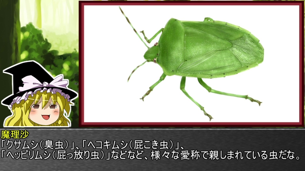 大変お待たせしました!昆虫の方も久しぶりに投稿します。<br><br>本シリーズは全て写真などを元に描いた私の手書きイラストで虫を紹介します。<br><br>第三十回目はカメムシ界を代表する「アオクサカメムシ」を解説します。<br>また「オオトビサシガメ」などについても触れています。<br><br><a href="https://www.nicovideo.jp/watch/sm35533594" class="watch">sm35533594</a>←前 次→まだ<br>マイリスト→<a href="https://www.nicovideo.jp/mylist/36849945" target="_blank" rel="noopener">mylist/36849945</a><br><br>◆その他企画◆<br>ゆっくり霊夢とやる夫が学ぶ ウルトラ怪獣大百科(SS版)→<a href="https://ch.nicovideo.jp/article/ar214243" target="_blank" rel="noopener">ar214243</a><br>ウルトラマンの怪獣やゴジラなど他のシリーズは、このマイリスからどうぞ→<a href="https://www.nicovideo.jp/mylist/39889181" target="_blank" rel="noopener">mylist/39889181</a><br>生放送とかをやっている怪獣コミュニティ→co1805608