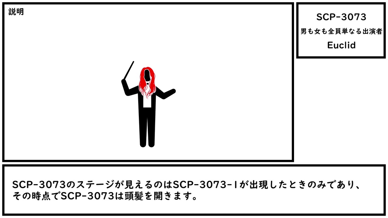 全世界は舞台だ。<br>そして男も女も、みんなただの役者にすぎない。<br>それぞれが登場しては、次々と退場してゆく。<br>そして、時代に適った者は、いくつもの役を演じるのだ。<br>──ウィリアム・シェイクスピア/お気に召すまま<br><br>本家記事 <a href="http://scp-wiki.wikidot.com/scp-3073" target="_blank" rel="noopener nofollow">http://scp-wiki.wikidot.com/scp-3073</a><br>翻訳記事 <a href="http://scp-jp.wikidot.com/scp-3073" target="_blank" rel="noopener nofollow">http://scp-jp.wikidot.com/scp-3073</a><br>作者 SatisfiedShark<br>SCP財団 <a href="http://scp-jp.wikidot.com" target="_blank" rel="noopener nofollow">http://scp-jp.wikidot.com</a><br>過去の動画はこちら <a href="https://www.nicovideo.jp/mylist/67620202" target="_blank" rel="noopener">mylist/67620202</a><br>CC-BY-SA 3.0