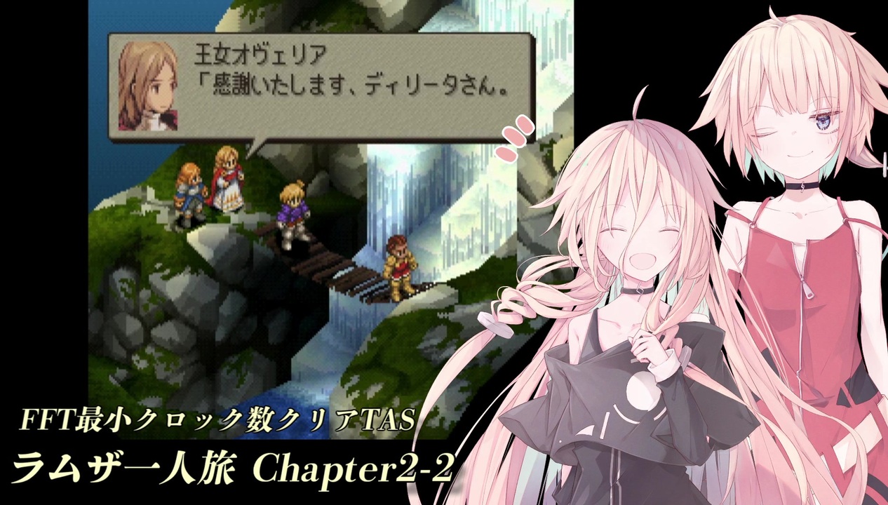 1年で聖剣技を身につけたディリータとJP・経験値すら取得できなかったラムザ、どうして差がついたのか……。<br>ゼイレキレの滝の戦いは、今シリーズで最長の戦闘時間となっております。<br><br>--<br>PS版FFTのシナリオを最小クロック・ラムザ一人でクリアするTAS動画です。<br>合成音声による解説がありますので、苦手な方はご注意ください。<br><br>【プレイ条件】<br>1. 戦闘はシナリオ順に最小クロックでクリア<br>2. ラムザ一人旅(ラムザ一人のみ出撃、途中の味方加入禁止)<br> ※ シナリオ上、強制参加となるゲストユニットは例外<br>3. バグ(JPカンストバグ等)利用禁止<br>4. データセーブおよびロード禁止<br><br>【プレイ環境】<br>エミュレータ: BizHawk 2.3.1<br>最終キー入力: 75,813,586 F(355:10:29.209)<br>追記回数: 647,200<br><br>【プレイ資料やキームービーファイル等】<br><a href="https://ux.getuploader.com/fftminclock/" target="_blank" rel="noopener nofollow">https://ux.getuploader.com/fftminclock/</a><br>pass: fft-min-clock<br><br>【お借りした素材】<br>◆IA -ARIA ON THE PLANETES- ver0.7 / 桧野 拓海 様 (<a href="https://seiga.nicovideo.jp/seiga/im10561893" target="_blank" rel="noopener">im10561893</a>)<br>◆ OИE -ARIA ON THE PLANETES- 立ち絵素材2 / 桧野 拓海 様 (<a href="https://seiga.nicovideo.jp/seiga/im10560014" target="_blank" rel="noopener">im10560014</a>)<br>◆ ニコニ・コモンズ<br><br><a href="https://www.nicovideo.jp/watch/sm38768279" class="watch">sm38768279</a> < 前:次 > <a href="https://www.nicovideo.jp/watch/sm38835460" class="watch">sm38835460</a><br>マイリスト:<a href="https://www.nicovideo.jp/mylist/70913527" target="_blank" rel="noopener">mylist/70913527</a><br>進捗報告:<a href="https://twitter.com/spherewind1" target="_blank" rel="noopener nofollow">https://twitter.com/spherewind1</a>