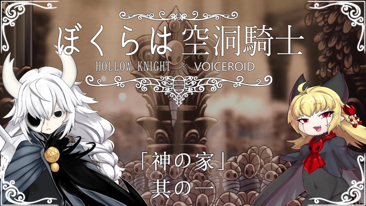 <strong>『ぼくらは空洞騎士』神の家編 其の一</strong><br>小さくなったあかりちゃんと、それを見守る者たちの、<br>『HollowKnight』を舞台にしたお話です。<br><br>おなかへったなあ。<br><span style="color: #000000; font-size: 14px;">―放浪者の日誌より―</span><br><br>「真エンドクリアまで縛りをする」は達成したあかりを待っていたのは、また縛りだった。<br>凋落の後に住み着いた祈りと嘆き。<br>永遠なる王国が生み出したゴミ溜め。<br>釘と殻、芸術と富とを夢の中に混ぜてブチまけた、<br>ここはハロウネストのソウルの吹き溜まり。<br>「神の家」<br>次回もあかりと地獄に付き合ってもらう。<br>※要約:本編での縛りは解除します。<br><br><a href="https://www.nicovideo.jp/mylist/69010174" target="_blank" rel="noopener">mylist/69010174</a><br><br>次>まだできてない<br><br>▼本編バックナンバー<br><a href="https://www.nicovideo.jp/watch/sm36786120" class="watch">sm36786120</a><第一話 <br><a href="https://www.nicovideo.jp/watch/sm38154009" class="watch">sm38154009</a><最終話(前編)