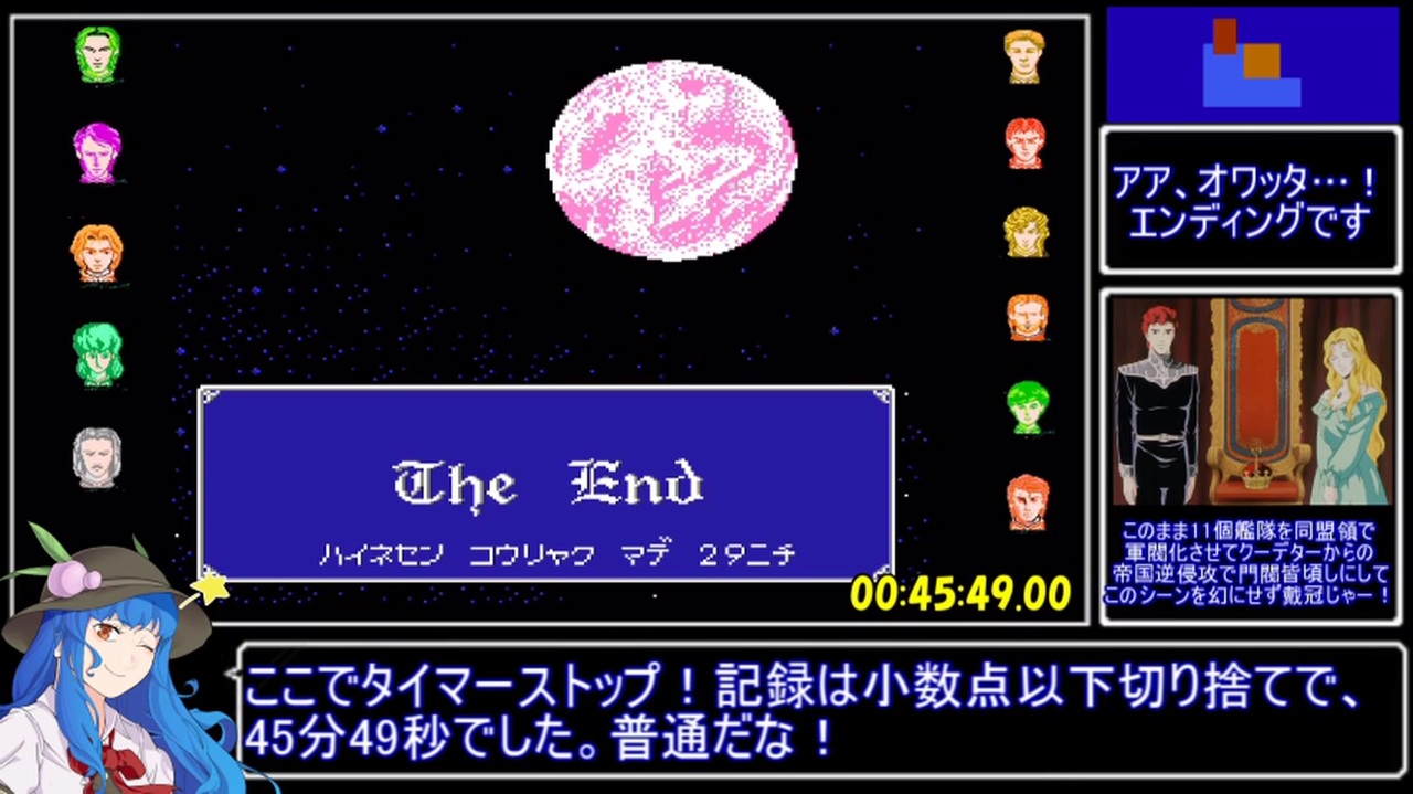 お待たせしました、終わり!平定!<br><br>冒頭数分、前回の訂正を入れております。<br>ヤン・ウェンリーの恐ろしさを思う存分味わえる作品だと思います。<br>決して完成度の高い作品ではありませんが、<br>クソゲーと断じてしまうには惜しい部分が多々あります。<br>次回ですが長編RPGを予定しており、先駆者兄貴のチャート確認や<br>多大な練習・試走が必要になると思いますので少し時間を頂きます。<br><br>誤字:熱く遇する→厚く遇する 弁解の余地なし、自らを裁け。<br><br>ハイネセン侵攻開始~クリアまで<br>前→<a href="https://www.nicovideo.jp/watch/sm38710112" class="watch">sm38710112</a><br>次→銀河放浪伝説 <a href="https://www.nicovideo.jp/watch/sm12420402" class="watch">sm12420402</a><br><br>FC銀英伝マイリスト→<a href="https://www.nicovideo.jp/mylist/70918118" target="_blank" rel="noopener">mylist/70918118</a><br><br>次作出来ました→G-ARMS オペレーションガンダムRTA <a href="https://www.nicovideo.jp/watch/sm39842469" class="watch">sm39842469</a><br><br>第一弾:蓬莱学園の冒険!RTA→<a href="https://www.nicovideo.jp/mylist/69522553" target="_blank" rel="noopener">mylist/69522553</a><br>11年前のelona動画→<a href="https://www.nicovideo.jp/mylist/19210992" target="_blank" rel="noopener">mylist/19210992</a>