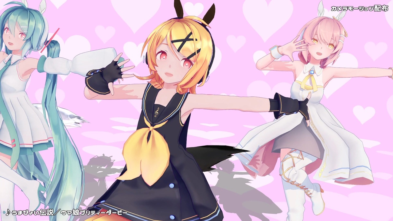 ずきゅんどきゅん 走り出しー(ふっふー)<br>ばきゅんぶきゅん かけてーゆーくーよー<br><br>盗賊@つばきPさんの「うまぴょい伝説」のモーションにカメラ付けてみました(≧▽≦)<br>今回はレンくんはお休みで、ルカさん参加で3人にウマ娘になりきってもらいました!<br>もうもう大好きな曲でテンション上がり過ぎて、いつも以上に刻みまくってます(;^_^A<br>まるでレースをしているようなスピード感溢れるカメラで可愛い3人をとくとご覧あれ!<br><br>カメラモーション配布しています。<br>><a href="https://bowlroll.net/file/255197" target="_blank" rel="noopener nofollow">https://bowlroll.net/file/255197</a><br>解凍PWは、この説明文の最初のフレーズです。<br><br>ニコニコでカメラ使って頂きました!<br>><a href="https://commons.nicovideo.jp/works/sm38810913/tree/children" target="_blank" rel="noopener nofollow">https://commons.nicovideo.jp/works/sm38810913/tree/children</a><br>YouTubeでカメラ使って頂きました!<br>><a href="https://www.youtube.com/playlist?list=PLC_uSlhOor2jXtpziScUj17DA5BV6SPFL" target="_blank" rel="noopener nofollow">https://www.youtube.com/playlist?list=PLC_uSlhOor2jXtpziScUj17DA5BV6SPFL</a><br><br><span style="font-size: 16px;"><strong>ミーネンロイマー様、沈黙の人様、冴。様、無重力様、y-puppy様、<br>static様、nuxy様、盗賊@つばきP様、ジェット炎様、はあんず様、<br>うにを様、かさね1010様、ますたー様、もみもみ様、マルド様、<br>れんねる様、Naoki Yamakawa様、G- YOU様、バラモスバンパイア様、<br>だるま様、ノン様、かーこんパンチ様、けいたぼ様、Asashio様、<br>yamano様、LLC様、...様、れに様、ny0g4n様、Deki-Hi様、<br>しゃん子様、WBC様、イクラえもん様、TEPIA様、ツンデレたん様、<br>ヒイロユイ様、rusifel様、れに様、ヒロ研究所(ヒロP) 様、<br>MM-MFP様、iida様、広告ありがとうございます!</strong></span><br>僕のカメラが ずきゅんどきゅん 走り出しー ばきゅんぶきゅん <br>伸びてーゆーくーよー ミー様の広告 あーるからー<br><br>楽曲:ウマ娘 プリティーダービーより<br>ダンス:足太ぺんた様 <a href="https://www.nicovideo.jp/watch/sm38744051" class="watch">sm38744051</a><br>モーション:盗賊@つばきP様 <a href="https://www.nicovideo.jp/watch/sm38776300" class="watch">sm38776300</a><br>モデル:Sour暄様<br>ステージ:ありさと様<br>アクセサリ:デメキッパ様/winglayer様<br>エフェクト:ドゥドゥ様<br><br /><span style="color: #0000ff;">カメラモーション配布シリーズ</span>><a href="https://www.nicovideo.jp/series/24541" target="_blank" rel="noopener">series/24541</a><br>ブッとんでいけ!<a href="https://www.nicovideo.jp/watch/sm45781308" class="watch">sm45781308</a> 2025/12/30 配布開始 <span style="color: #ff0000;">New!!</span><br>YouTubeはこちら↓<br>><a href="https://www.youtube.com/playlist?list=PLC_uSlhOor2gzlT7JCXbwJGgxZ00QekiO" target="_blank" rel="noopener nofollow">https://www.youtube.com/playlist?list=PLC_uSlhOor2gzlT7JCXbwJGgxZ00QekiO</a><br><br><span style="color: #ff0000;"><strong>どりーみんチュチュ カメラ配布動画</strong></span><br><span style="color: #ff0000; font-size: 16px;"><strong>YouTubeにて78万再生突破 !!</strong></span><br>><a href="https://youtu.be/EG19VETMBqg" target="_blank" rel="noopener nofollow">https://youtu.be/EG19VETMBqg</a><br><br>カメラ使って頂きました最新情報はこちら!<br>><a href="https://x.com/eichan2222" target="_blank" rel="noopener nofollow">https://x.com/eichan2222</a>