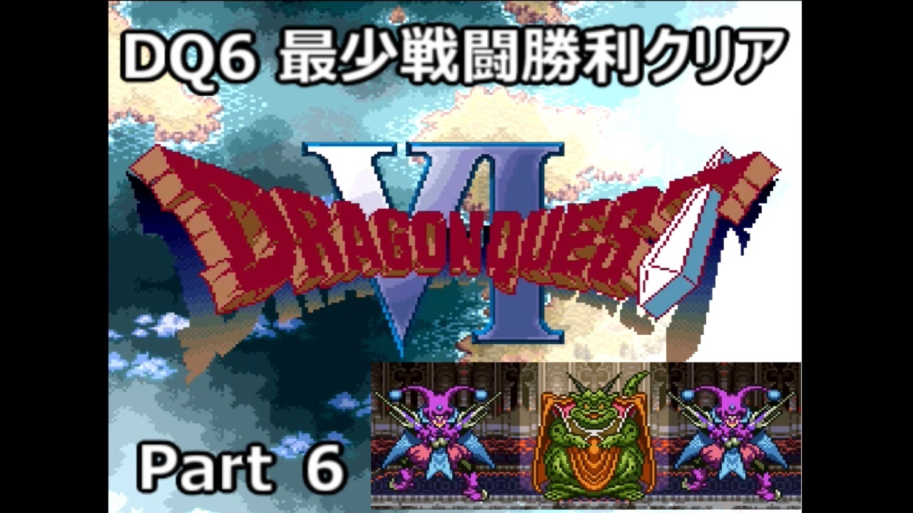 Part6前編、ムドー(2戦目)戦です。<br><br>ドラゴンクエスト6の縛りプレイです。<br>縛り内容は以下の通り。<br><br>プレイ条件<br>1. 最少戦闘勝利回数クリア(全38戦)<br>2. 必須戦闘での稼ぎなし(仲間呼びでの経験値稼ぎ)<br>3. ダーマ神殿の利用不可<br>4. 編集は頑張らない<br>(バグによる戦闘回避なし)<br>(道中戦闘はひたすら逃げてます)<br><br><a href="https://www.nicovideo.jp/watch/sm38796110" class="watch">sm38796110</a>←Part5|Part6後編→<a href="https://www.nicovideo.jp/watch/sm38832829" class="watch">sm38832829</a><br>Part1→<a href="https://www.nicovideo.jp/watch/sm38699804" class="watch">sm38699804</a><br><br>youtube→<a href="https://www.youtube.com/channel/UCXkpWUmmGrMigseRKwhvroA" target="_blank" rel="noopener nofollow">https://www.youtube.com/channel/UCXkpWUmmGrMigseRKwhvroA</a><br>twitter→<a href="https://twitter.com/Hakusai_kkmsn" target="_blank" rel="noopener nofollow">https://twitter.com/Hakusai_kkmsn</a><br><br>この動画で利用している株式会社スクウェア・エニックスを代表とする共同著作者が権利を所有する著作物及びスギヤマ工房有限会社が権利を所有する楽曲の転載・配布は禁止いたします。<br>© 1995 ARMOR PROJECT/BIRD STUDIO/HEART BEAT/SQUARE ENIX All Rights Reserved.<br>© SUGIYAMA KOBO
