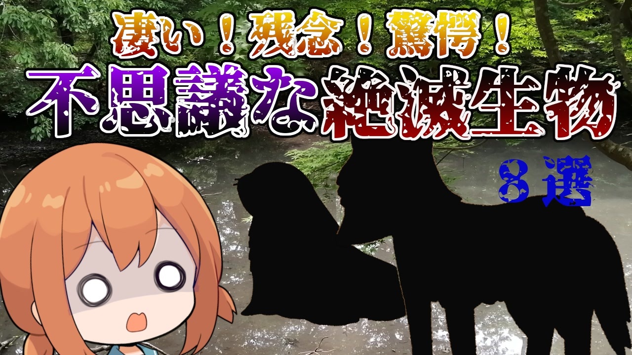 世界で発見されている生物の種類は、約175万種もいると言われています。<br>その一方で、年間4万種の生物が絶滅しています。今回は残念な理由で絶滅してしまった生物<br>や凄い能力を持っていたけど絶滅してしまった不思議な生物を紹介します!<br><br>※誤字ありましたので勘違いなさらないようお願い申し上げます<br><br>【動画の注意点】<br>・特徴を模写したイメージ画像が多数あります<br> 実際の姿とは異なる場合があります<br>・誤字:ダイアオオカミ(30万年前から1万年前)です 音声ではしっかりと話しております <br>(化石があるとも伝えております)<br><br>面白いと思ったらいいね!マイリス&フォローしてくださいませ!<br><br>「いいね!」するとコメントが出るよ<br><br>前の動画: <a href="https://www.nicovideo.jp/watch/sm38808168" class="watch">sm38808168</a><br><br>【コメント・いいね頂いた皆様へ】<br>元気になります!ありがとうございます<br><br>【広告を頂いた皆様へ】<br>ありがたく思っております。<br>凄く励みになります。<br>これからも頑張ります。<br><br>【コメントへのお返し(一部のみ)】<br>なんでいらすとあるの?<br> →画像がなかったため、合成しました<br><br>【使用素材】<br>空想曲線 <a href="https://kopacurve.blog.fc2.com/" target="_blank" rel="noopener nofollow">https://kopacurve.blog.fc2.com/</a><br><br>【使用BGM・効果音】<br>◆DOVA-SYNDROME<br><a href="http://dova-s.jp/" target="_blank" rel="noopener nofollow">http://dova-s.jp/</a><br>◆MusMus<br><a href="https://musmus.main.jp/info.html" target="_blank" rel="noopener nofollow">https://musmus.main.jp/info.html</a><br>◆効果音ラボ<br><a href="https://soundeffect-lab.info/" target="_blank" rel="noopener nofollow">https://soundeffect-lab.info/</a><br>◆効果音:ポケットサウンド –<br>@UCkcmg8yBpJk5I1fwu0sabJg<br><br>【キャラ制作】<br>製作:たもと 様<br><br>【VOICEROID音声】<br>カナ:東北きりたん<br>お姉さん:結月ゆかり<br><br> <br>※この動画は実在する人物や名称に一切関係なくフィクションです。<br>※姉が妹に紹介・解説しているところを見て楽しむエンタメ系動画です。決して視聴者様の学習目的の動画ではありません。また賛否両論がある内容に関しましては姉や妹の視点で見た感想となります。批判目的は一切ございませんのでご容赦ください<br>※著作権や肖像権を侵害する目的は一切ございません。<br><br>