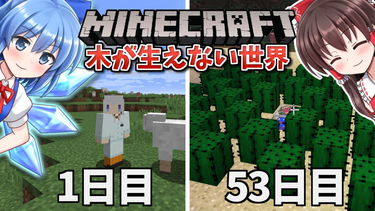 なんかYoutubeで話題になってるらしい、マイクラの100日間を記録する「100days」という企画をやってみることにします。<br>「木が生えない世界なのにMODの力で木を大量生産して、木を使いまくる」という趣旨の企画です(後付け)<br><br>=============木が生えない世界で100日間サバイバル!===============<br>Minecraft Ver1.12.2<br>立ち絵:ふにちか 様<br>霊夢: <a href="https://seiga.nicovideo.jp/seiga/im9999918" target="_blank" rel="noopener">im9999918</a> 魔理沙: <a href="https://seiga.nicovideo.jp/seiga/im10034978" target="_blank" rel="noopener">im10034978</a> 妖夢: <a href="https://seiga.nicovideo.jp/seiga/im10525425" target="_blank" rel="noopener">im10525425</a> チルノ: <a href="https://seiga.nicovideo.jp/seiga/im10616905" target="_blank" rel="noopener">im10616905</a><br>※立ち絵の使い方(使い方を直接作者様に聞くのはご遠慮ください)<br>①<a href="https://www.nicovideo.jp/watch/sm36965211" class="watch">sm36965211</a> ②<a href="https://www.nicovideo.jp/watch/sm36965343" class="watch">sm36965343</a><br>