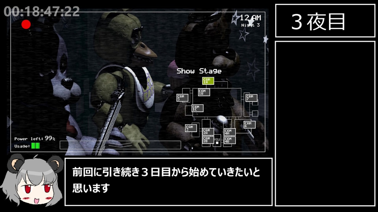 <span style="color: #ff9900; font-size: 24px;">本当に申し訳ない。</span><br>編集ソフトでの不具合によりRTAのタイムが46分14秒ではなく46分17秒でした。<br>動画後半でも説明しています。お兄さん許して<br><a href="https://www.nicovideo.jp/watch/sm38838632" class="watch">sm38838632</a> ←前回 次回→ <a href="https://www.nicovideo.jp/watch/sm38856923" class="watch">sm38856923</a><br>Five Nights at Freddy's 通称FNAFのany%RTAのpart2、3夜目となります<br>広告してくださった皆様本当にありがとうございます。次回の動画の最後に紹介させていただきます。<br>次の動画も頑張ります!<br><br><br />FNAF RTAマイリスト <a href="https://www.nicovideo.jp/mylist/71729876" target="_blank" rel="noopener">mylist/71729876</a><br>参考にさせていただいているWiki様→<a href="https://fnaf.swiki.jp/" target="_blank" rel="noopener nofollow">https://fnaf.swiki.jp/</a><br>Twitter→ <a href="https://twitter.com/shilviass" target="_blank" rel="noopener nofollow">https://twitter.com/shilviass</a><br>youtube→<a href="https://www.youtube.com/channel/UCmOIEb76TtHFbBYzMRQpAUQ" target="_blank" rel="noopener nofollow">https://www.youtube.com/channel/UCmOIEb76TtHFbBYzMRQpAUQ</a>