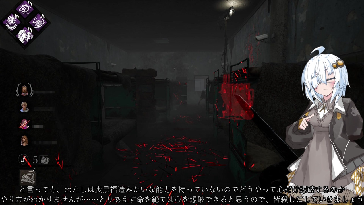 滲み出す性格の悪さ 破道の九十・黒棺<br><br><a href="https://www.nicovideo.jp/watch/sm38296712" class="watch">sm38296712</a>←前回 リスト <a href="https://www.nicovideo.jp/mylist/62705262" target="_blank" rel="noopener">mylist/62705262</a> 次回→<a href="https://www.nicovideo.jp/watch/sm40338465" class="watch">sm40338465</a><br><br>パーク説明<br><br>・呪術:破滅<br>トーテムの1つに呪いが付与される<br>生存者が発電機の修理を中断すると、自動的に後退状態となる。<br>この後退状態では通常後退速度の100・150・200%で後退する。<br>ただし、この効果は付与された呪いのトーテムがある間持続する<br><br>・看護婦の使命<br>20・24・28m以内で治療をしている生存者と治療されている生存者のオーラを可視化する。<br><br>・バーベキュー&チリ<br>生存者をフックに吊るすと効果発動。<br>吊るしたフックから40m以上離れている生存者を4秒間可視表示する。<br>また各生存者を初めて吊るすと専用ポイントを1個取得する。(最大2・3・4個)<br>1個につき最終獲得BPが25%増加する。 (最大:50・75・100%)<br><br>・伝播する怖気<br>殺人鬼が生存者を瀕死状態にした時、殺人鬼の脅威範囲内にいる生存者全員が<br>叫び声をあげ、4・5・6秒間殺人鬼に位置が通知される<br>