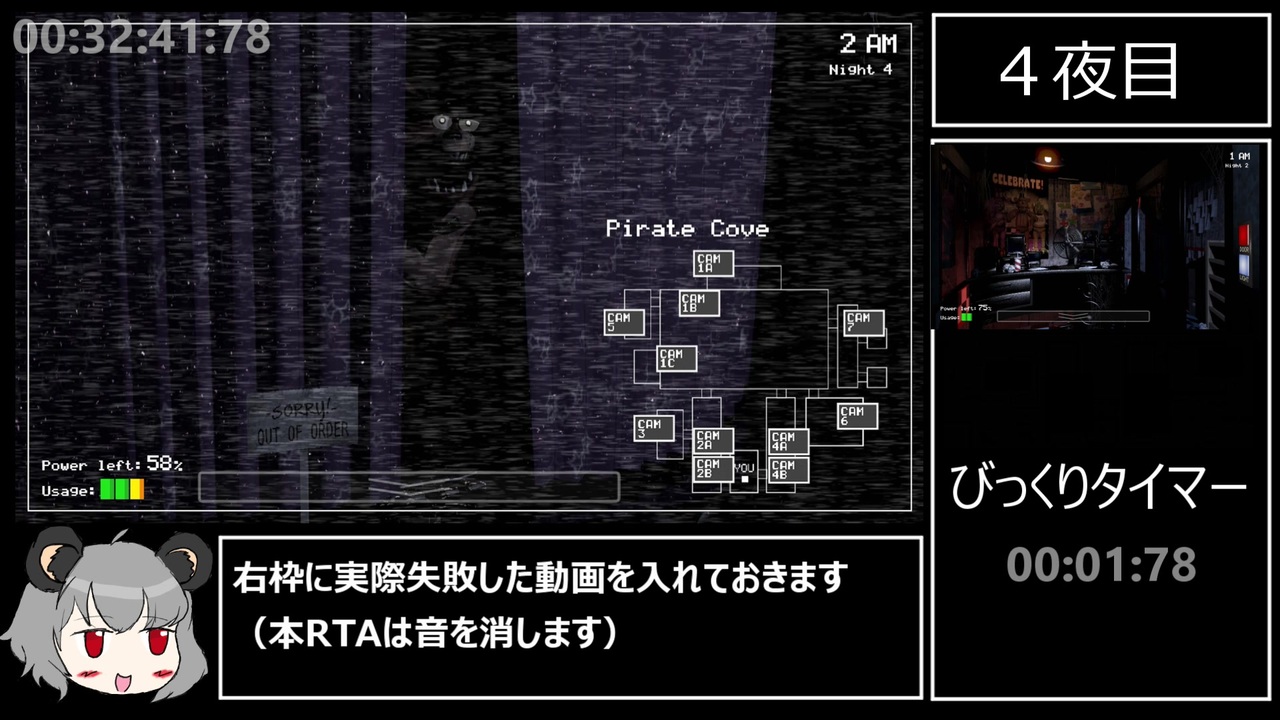 <span style="color: #cc0000; font-size: 24px;">このシリーズは4日目からが本番ですよ</span><br>Five Nights at Freddy's 通称FNAFのany%RTAのpart3、4夜目となります<br>次で最後ですが頑張ります!<br><a href="https://www.nicovideo.jp/watch/sm38846766" class="watch">sm38846766</a> ←前回 次回→ <a href="https://www.nicovideo.jp/watch/sm38870663" class="watch">sm38870663</a><br><a href="https://www.nicovideo.jp/watch/sm38838632" class="watch">sm38838632</a> ←part1<br><br><br>広告入れ忘れチャッタ…のでここで紹介させていただきます。<br>part1<br>White_Catさん 鳳 飛龍さん×2 <a href="https://www.nicovideo.jp/watch/cd4" class="watch">cd4</a>さん れうすきさん パンツ屋さん×4 赤城 大和さん<br>くらばさん gengaさん ddlさん jalaxさん 雪達磨さん 0501095abcさん りるさん×2<br>芝駿さん ネポさん えんどのATMさん×7 ryu-さん 一矢さん<br>part2<br>ot.さん <a href="https://www.nicovideo.jp/watch/cd4" class="watch">cd4</a>さん White_Catさん りるさん×2 団子さん×5 リクルさん×4 TKNさん<br>ネポさん 0501095abcさん jalaxさん 鳳 飛龍さん×2 ゲストさん×2 雪達磨さん <br>Kumatoraさん×2<br>たくさんの広告ありがとうございます!最終回には載せさせていただきます。<br> <br><br><br />FNAF RTAマイリスト <a href="https://www.nicovideo.jp/mylist/71729876" target="_blank" rel="noopener">mylist/71729876</a><br>参考にさせていただいているWiki様→<a href="https://fnaf.swiki.jp/" target="_blank" rel="noopener nofollow">https://fnaf.swiki.jp/</a><br>Twitter→ <a href="https://twitter.com/shilviass" target="_blank" rel="noopener nofollow">https://twitter.com/shilviass</a><br>youtube→<a href="https://www.youtube.com/channel/UCmOIEb76TtHFbBYzMRQpAUQ" target="_blank" rel="noopener nofollow">https://www.youtube.com/channel/UCmOIEb76TtHFbBYzMRQpAUQ</a>