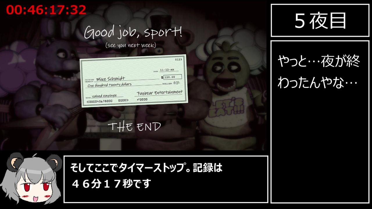 <span style="color: #ff0000; font-size: 18px;">別の仕事を見つけてこことはサヨナラするべきなんじゃない?</span><br><br>Five Nights at Freddy's 通称FNAFのany%RTAのpart4、最終日5夜目となります<br>いままで見てくださった皆様に多大なる感謝を<br>Golden Freddy出ませんでした…海外サイトで調べたところ1夜目と3夜目に出やすいそうです<br>次回動画→もう出てます<br><a href="https://www.nicovideo.jp/watch/sm38856923" class="watch">sm38856923</a> ←前回 <br><a href="https://www.nicovideo.jp/watch/sm38838632" class="watch">sm38838632</a> ←part1<br><a href="https://www.nicovideo.jp/watch/sm38903652" class="watch">sm38903652</a> ←FNAF2RTApart1<br>最後の曲 Five Nights at Freddy's 1 Song<br><br><a href="https://www.youtube.com/watch?v=l18A5BOTlzE" target="_blank" rel="noopener nofollow">https://www.youtube.com/watch?v=l18A5BOTlzE</a><br />FNAF RTAマイリスト <a href="https://www.nicovideo.jp/mylist/71729876" target="_blank" rel="noopener">mylist/71729876</a><br>参考にさせていただいているWiki様→<a href="https://fnaf.swiki.jp/" target="_blank" rel="noopener nofollow">https://fnaf.swiki.jp/</a><br>Twitter→ <a href="https://twitter.com/shilviass" target="_blank" rel="noopener nofollow">https://twitter.com/shilviass</a><br>youtube→<a href="https://www.youtube.com/channel/UCmOIEb76TtHFbBYzMRQpAUQ" target="_blank" rel="noopener nofollow">https://www.youtube.com/channel/UCmOIEb76TtHFbBYzMRQpAUQ</a>