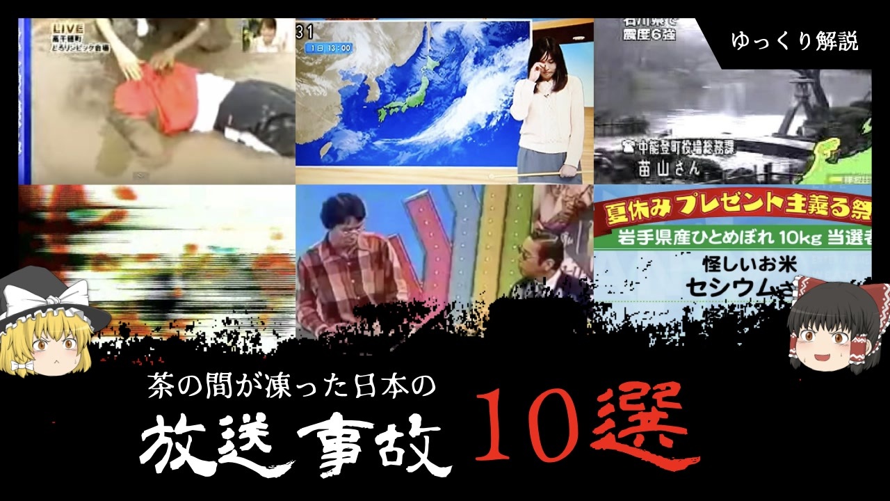 おはようです、いつもありがとうございます。<br><br><strong><u>今回は茶の間が凍った放送事故を10個紹介しますよ。</u></strong><br><br>皆さんの見解も知りたいです、コメントよろしくおねがいします!<br><br><span style="color: #ff0000;"><strong>いいねとフォロー、Youtubeのチャンネル登録をどうか<br>何卒、何卒よろしくお願いいたします・・・っ!!</strong></span><br><br><a href="https://www.youtube.com/c/おしえてオカルト先生" target="_blank" rel="noopener nofollow">https://www.youtube.com/c/おしえてオカルト先生</a><br><br>僕ももしライブ配信した時は放送事故を起こさないように気をつけます<br><br><strong>【目次】</strong><br>1. いいとも不審者乱入<br>2. ポリゴンショック<br>3. それ行け!キクマ<br>4. 湖の水死体<br>5. 石鹸工場爆発事故<br>6. お天気お姉さん号泣事件<br>7. 起こして<br>8. セシウムさん<br>9. 思いっきりDON!<br>10. 苗山さん<br><br><strong>【投稿動画はこちら】</strong><br><a href="https://www.nicovideo.jp/mylist/71081372" target="_blank" rel="noopener">mylist/71081372</a><br><br><strong>【Twitterはこちら】<br>フォロワー少なすぎて草</strong><br><a href="https://twitter.com/FGCZyMwjXCdOhR4" target="_blank" rel="noopener nofollow">https://twitter.com/FGCZyMwjXCdOhR4</a><br><br><strong>【テロップ】</strong><br>びたちー素材館<br><a href="http://www.vita-chi.net/sozai1.htm" target="_blank" rel="noopener nofollow">http://www.vita-chi.net/sozai1.htm</a><br><br><strong>【広告ありがとうございます!】</strong><br><span style="color: #6aa84f;"><strong>隧道 さん brabra さん eucally さん セシウム さん ポァ さん er さん</strong></span>