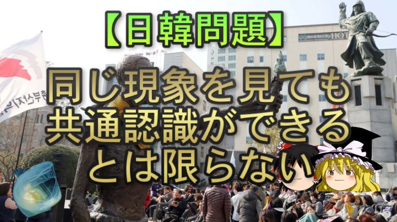 さて、本日は日本と韓国での価値観の違いにより、共通認識ができにくい件についてです。<br>いつも通り土曜日投稿<br><br>本日のブロマガ記事<br><a href="https://ch.nicovideo.jp/article/ar2027652" target="_blank" rel="noopener">ar2027652</a><br><br>元記事<br>同じ現象を見ても共通認識ができるとは限らない<br><a href="https://ch.nicovideo.jp/ooguchib/blomaga/ar2027649" target="_blank" rel="noopener nofollow">https://ch.nicovideo.jp/ooguchib/blomaga/ar2027649</a><br>関連記事<br>韓国社会では「記憶の改変」が起きているわけではない?<br><a href="https://ch.nicovideo.jp/ooguchib/blomaga/ar1777164" target="_blank" rel="noopener nofollow">https://ch.nicovideo.jp/ooguchib/blomaga/ar1777164</a><br><br>関連動画<br>【ゆっくり解説】日韓併合はなぜ合法? part1/2<br><a href="https://www.nicovideo.jp/watch/sm37651726" class="watch">sm37651726</a><br>【日韓問題】韓国人は記憶の改変をしているわけではない?<br>/<a href="https://www.nicovideo.jp/watch/sm35775418" class="watch">sm35775418</a><br>【日韓・マスコミ問題】徴用工裁判問題の予備知識<br><a href="https://www.nicovideo.jp/watch/sm35620683" class="watch">sm35620683</a><br>【日韓問題】日韓で異なる「正しさ」の概念 前編<br><a href="https://www.nicovideo.jp/watch/sm31616028" class="watch">sm31616028</a><br>【日韓問題】韓国独特の「ウリ」と「ナム」の概念 前編<br><a href="https://www.nicovideo.jp/watch/sm31815129" class="watch">sm31815129</a><br><br>引用ソースと動画のテキストをブロマガ日韓問題(初心者向け)のほうへ掲載しています。<br><br>日韓問題(初心者向け)<br><a href="https://ch.nicovideo.jp/ooguchib/blomaga" target="_blank" rel="noopener nofollow">https://ch.nicovideo.jp/ooguchib/blomaga</a><br><br>暇つぶしにどうぞ<br><a href="http://ooguchib.blog.fc2.com/" target="_blank" rel="noopener nofollow">http://ooguchib.blog.fc2.com/</a> <br><br>twitter @ooguchib<br><a href="https://twitter.com/ooguchib" target="_blank" rel="noopener nofollow">https://twitter.com/ooguchib</a><br><br>前 <a href="https://www.nicovideo.jp/watch/sm38849647" class="watch">sm38849647</a> <a href="https://www.nicovideo.jp/mylist/59069876" target="_blank" rel="noopener">mylist/59069876</a> 次回 <a href="https://www.nicovideo.jp/watch/sm38911010" class="watch">sm38911010</a><br><br>番外編マイリスト<br><a href="https://www.nicovideo.jp/mylist/62992608" target="_blank" rel="noopener">mylist/62992608</a><br><br>YouTube版<br><a href="https://youtu.be/-ISncrKJ6Gk" target="_blank" rel="noopener nofollow">https://youtu.be/-ISncrKJ6Gk</a><br><br>
