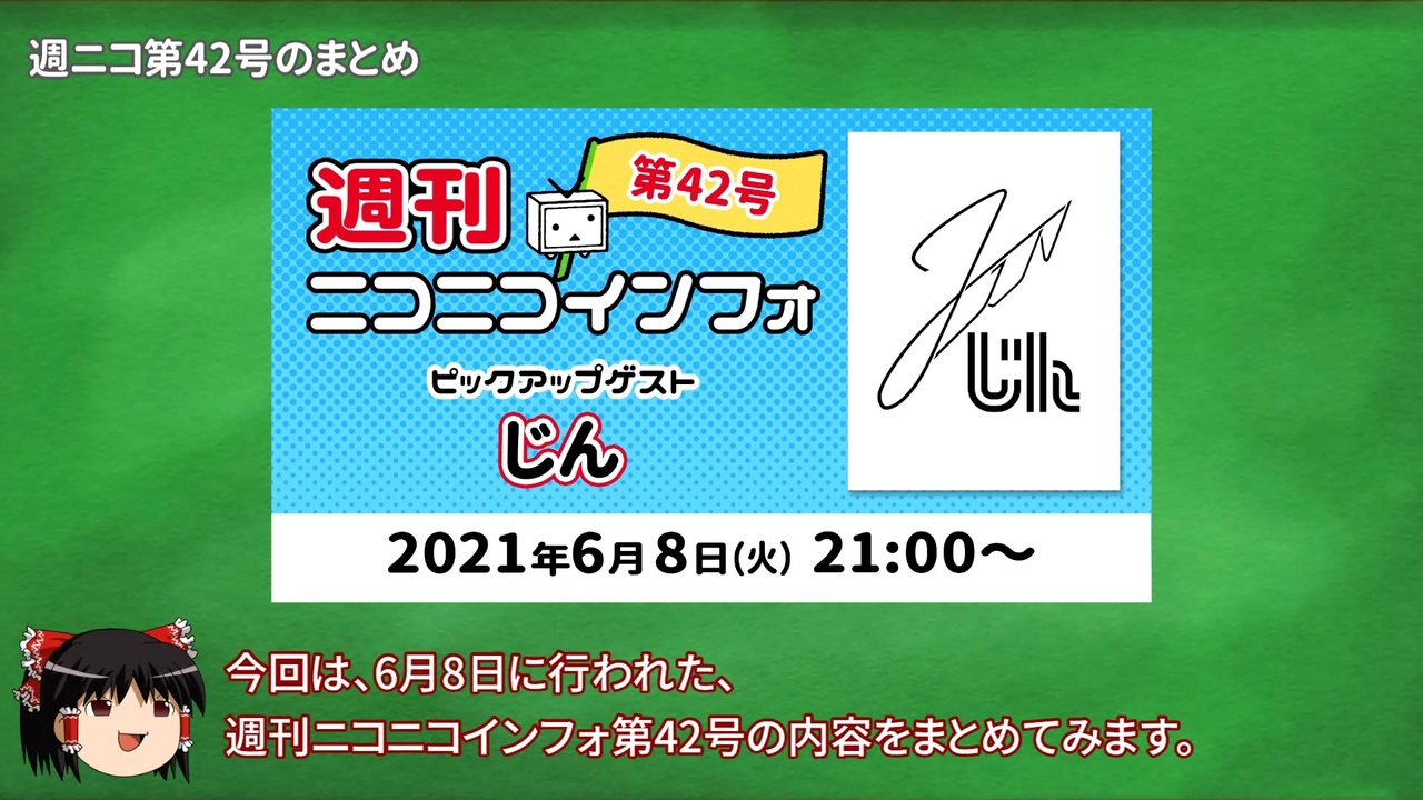 6月8日(火)放送の週刊ニコニコインフォ第42号(<a href="https://live.nicovideo.jp/watch/lv331970023" target="_blank" rel="noopener">lv331970023</a>)のまとめ動画です。<br><br>↓再生時間をクリックすると、それぞれのセクションに飛びます。<br><a href="#" class="seekTime" data-seekTime="00:32" onclick="seekNicoPlayer('#00:32'); return false;">#00:32</a> NicoBoxリニューアル<br><a href="#" class="seekTime" data-seekTime="02:09" onclick="seekNicoPlayer('#02:09'); return false;">#02:09</a> 新サービス・ニコニ貢献<br><br><a href="#" class="seekTime" data-seekTime="05:23" onclick="seekNicoPlayer('#05:23'); return false;">#05:23</a> ゲストからニコニコへ: じん さん<br><a href="#" class="seekTime" data-seekTime="06:06" onclick="seekNicoPlayer('#06:06'); return false;">#06:06</a> 次回予告<br><br>注意: この動画で紹介する内容は、動画投稿時点のものであり、また誤りを含む可能性があります。気づいた点があれば、ぜひコメントで補足してもらえると助かります。<br><br>公式運営生放送「週刊ニコニコインフォ」の過去のタイムシフト(<strong>いつでも誰でも視聴可</strong>)や、今後の放送予定などは、「週刊ニコニコインフォチャンネル」をチェック!<br><a href="https://ch.nicovideo.jp/weekly-niconico-info" target="_blank" rel="noopener nofollow">https://ch.nicovideo.jp/weekly-niconico-info</a><br><br>今回の週ニコをNFF中心にまとめた公式動画↓<br>NicoBoxリニューアルについて: <a href="https://www.nicovideo.jp/watch/so38869603" class="watch">so38869603</a><br>新サービス「ニコニ貢献」について: <a href="https://www.nicovideo.jp/watch/so38869687" class="watch">so38869687</a><br><br>今回の週ニコをゲストコーナー中心にまとめた公式動画 → <a href="https://www.nicovideo.jp/watch/sm38986345" class="watch">sm38986345</a><br><br>今回の週ニコをまとめた公式のニュース記事はこちら↓<br>ゲストコーナー: <a href="https://originalnews.nico/319007" target="_blank" rel="noopener nofollow">https://originalnews.nico/319007</a><br>それ以外: <a href="https://originalnews.nico/318570" target="_blank" rel="noopener nofollow">https://originalnews.nico/318570</a><br /><br>※関連動画や前後の動画へは、この説明文の下にある「シリーズ」機能から移動できます<br><span style="font-size: 18px;"><strong>Twitter → <a href="https://twitter.com/nikosai2531" target="_blank" rel="noopener nofollow">https://twitter.com/nikosai2531</a></strong></span><br>その他上げた動画 → <a href="https://www.nicovideo.jp/user/11543832/video" target="_blank" rel="noopener nofollow">https://www.nicovideo.jp/user/11543832/video</a>