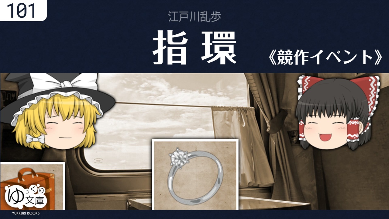 <span style="color: #ff0000;"><strong>101 指環はどこに消えた?──</strong></span><br>とある汽車でふたりの男が話していた。ふたりは以前も同じ路線で出会い、みかんを食べ、車内の事件に遭遇していた。あのとき、なにが起こったのか?<br><span style="color: green;">The Ring (1892) by Edogawa Ranpo</span><br><br>◆江戸川乱歩『指環』祭り◆<br>『指環』はセリフのみで構成された短編ミステリー小説。台本さんのつぶやきをキッカケに競作することになりました。解釈や表現のちがいをお楽しみください。<br>※支援絵、いまから参加、ウルトラ大歓迎。<br>※青空文庫 <a href="https://www.aozora.gr.jp/cards/001779/files/57197_58748.html" target="_blank" rel="noopener nofollow">https://www.aozora.gr.jp/cards/001779/files/57197_58748.html</a><br><br><a href="https://www.nicovideo.jp/watch/sm38889885" class="watch">sm38889885</a> ゆっくり文庫版<br><a href="https://www.nicovideo.jp/watch/sm38890062" class="watch">sm38890062</a> 台本・ナレーション担当:刀剣乱舞版<br><a href="https://www.nicovideo.jp/watch/sm38890230" class="watch">sm38890230</a> にゅんひ×ドランク狸:生声方言版<br><a href="https://www.nicovideo.jp/watch/sm38887686" class="watch">sm38887686</a> ルイス足永:ボイロ版<br><a href="https://www.nicovideo.jp/watch/sm38891358" class="watch">sm38891358</a> tairon版<br><a href="https://www.nicovideo.jp/watch/sm38932844" class="watch">sm38932844</a> とむ:立ち絵版<br><a href="https://www.nicovideo.jp/watch/sm38974792" class="watch">sm38974792</a> タガメ:B級版<br><a href="https://www.nicovideo.jp/watch/sm41002583" class="watch">sm41002583</a> 霧嶋:立ち絵版 <span style="color: #ff0000;">[new!]</span><br><a href="https://www.nicovideo.jp/watch/sm38894249" class="watch">sm38894249</a> 台本:祭りのあとがたり<br><a href="https://www.nicovideo.jp/watch/sm38894292" class="watch">sm38894292</a> 台本:編集後記(『指輪』は3本目)<br><br><a href="https://www.nicovideo.jp/watch/sm37232413" class="watch">sm37232413</a> ウソ予告まとめ5:生声サンプルあり<br><br>●乱歩と横溝<br><a href="https://www.nicovideo.jp/watch/sm32629937" class="watch">sm32629937</a> 横溝正史「犬神家の一族」(全3話+PV)<br><a href="https://www.nicovideo.jp/watch/sm34502341" class="watch">sm34502341</a> 横溝正史「百日紅の下にて」<br><a href="https://www.nicovideo.jp/watch/sm34642963" class="watch">sm34642963</a> 江戸川乱歩「心理試験」<br><a href="https://www.nicovideo.jp/watch/sm34676360" class="watch">sm34676360</a> 江戸川乱歩「双生児 -ある死刑囚が教誨師にうちあけた話-」<br><a href="https://www.nicovideo.jp/watch/sm37642159" class="watch">sm37642159</a> 江戸川乱歩「屋根裏の散歩者」<br><a href="https://www.nicovideo.jp/watch/sm38889885" class="watch">sm38889885</a> <span style="color: #ff00ff;"><strong>江戸川乱歩「指環」</strong></span><br><br>●ゆっくり文庫について<br>全部:<a href="https://www.nicovideo.jp/mylist/74874627" target="_blank" rel="noopener">mylist/74874627</a><br>近況:<a href="https://twitter.com/trynext" target="_blank" rel="noopener nofollow">https://twitter.com/trynext</a><br>---<br><br><br>