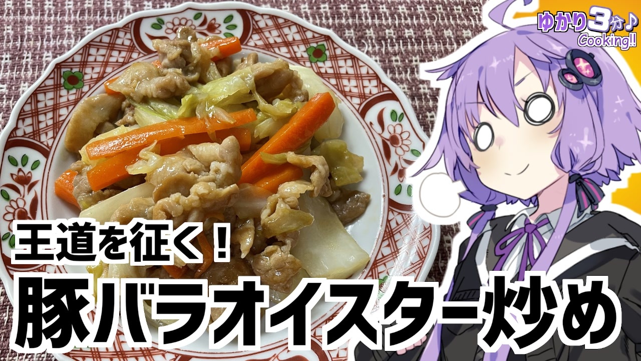 結月ゆかりを使用した料理動画です<br><br>オイスター炒めです!<br>オイスターはおい…やっぱやめとこっと!<br><br>私の秘策は『いいね!』を押して確認してくれよな!<br><br>今回使用した材料<br>豚バラ:150g キャベツ:1/8<br>ニンジン:半分 ニンニク:1欠<br>しょう油:大さじ1 酒:大さじ1<br>片栗粉:大さじ1 オイスターソース:大さじ1<br>みりん:大さじ2/3<br><br>前回のオイマヨ:<a href="https://www.nicovideo.jp/watch/sm38891890" class="watch">sm38891890</a><br>蹴上の絶景お花見スポット!JK旅:<a href="https://www.nicovideo.jp/watch/sm38890137" class="watch">sm38890137</a><br><br>オススメのボイロ劇場<br>茜ちゃんと葵ちゃんの現代怪異占い:<a href="https://www.nicovideo.jp/watch/sm38263500" class="watch">sm38263500</a><br><br>ツイッター:<a href="https://twitter.com/mrt89244817" target="_blank" rel="noopener nofollow">https://twitter.com/mrt89244817</a>