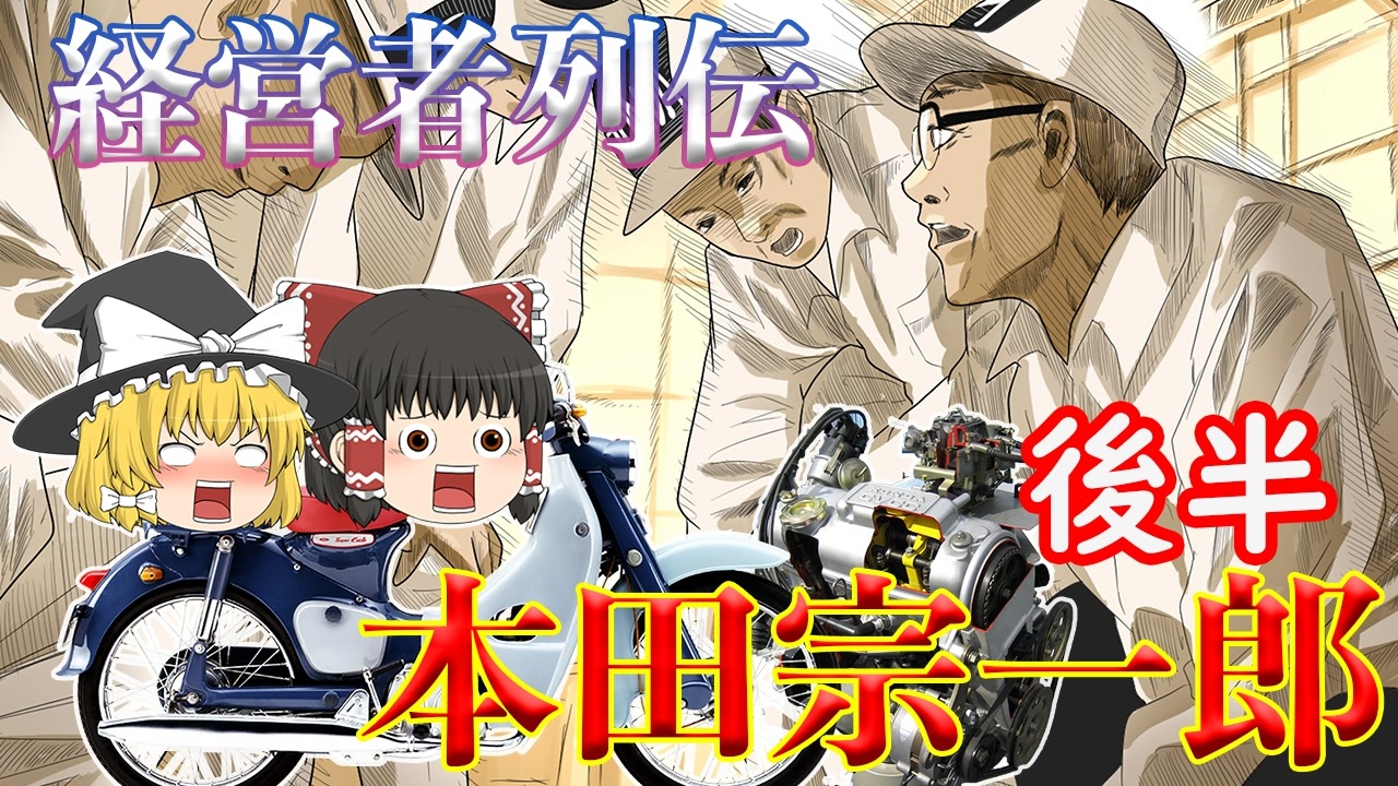 どうも係長です。<br><br>引越し予定で向こうで自動車が必要になって色々見てるんだけど最近の車は近未来感があって凄い。<br><br>本田技研工業の創業者本田宗一郎解説後半となります。<br>宗一郎の挑戦と世代交代の瞬間に注目です。<br><br>前半→<a href="https://www.nicovideo.jp/watch/sm38901937" class="watch">sm38901937</a><br>フォロー、マイリスお願いします。<br />ニコニコチャンネル始めました!!→<a href="https://ch.nicovideo.jp/cakachannel" target="_blank" rel="noopener nofollow">https://ch.nicovideo.jp/cakachannel</a> <br><br><span style="font-size: 13px;">Youtubuチャンネル(先行配信)→ <a href="https://goo.gl/fD5iYe" target="_blank" rel="noopener nofollow">https://goo.gl/fD5iYe</a></span><br>Youtubeサブチャンネル(VTuber配信)→<a href="https://bit.ly/2nQnNrQ" target="_blank" rel="noopener nofollow">https://bit.ly/2nQnNrQ</a><br>Youtubeゲームチャンネル→<a href="https://bit.ly/2oCMQz2" target="_blank" rel="noopener nofollow">https://bit.ly/2oCMQz2</a><br><span style="color: #000000; font-size: 13px;">X:(雑談・更新情報・なんかあれば等)→<a href="https://twitter.com/cakari14" target="_blank" rel="noopener nofollow">https://twitter.com/cakari14</a></span><br>ブログ→<a href="http://www.cakaricho.com/" target="_blank" rel="noopener nofollow">http://www.cakaricho.com/</a><br>コミュニティ→co1975392