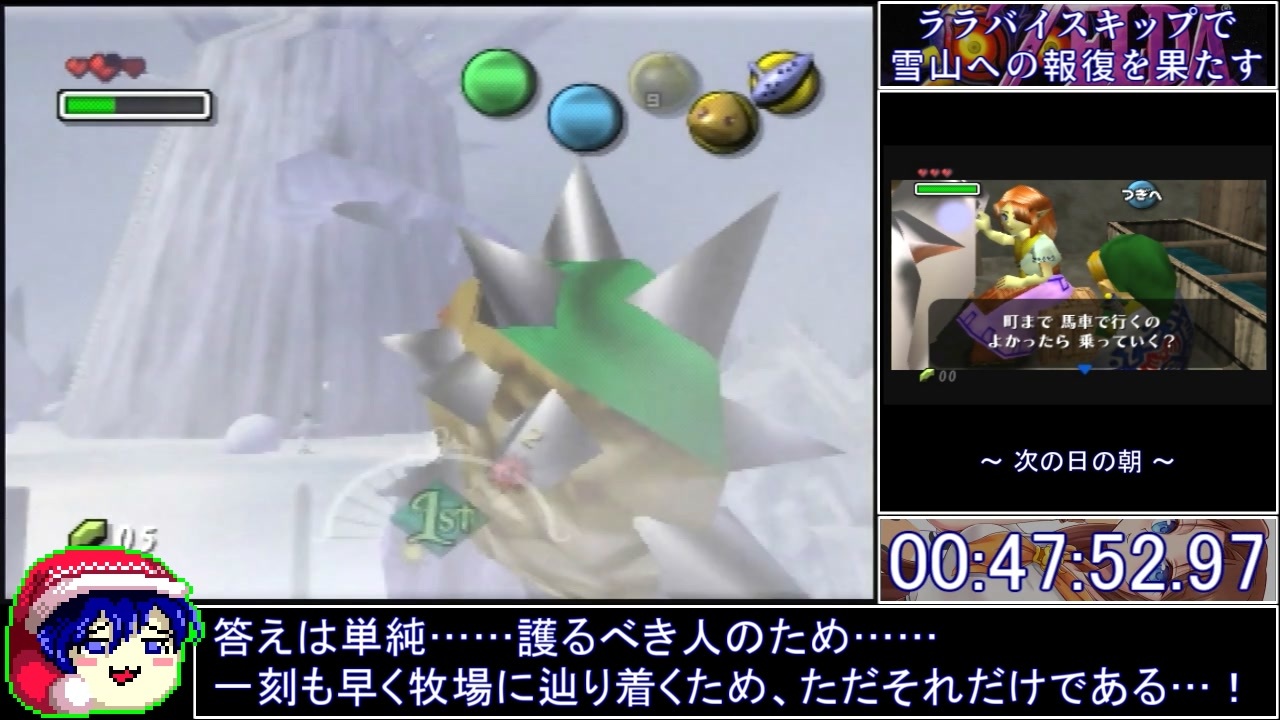 このゲームを初めて遊んでから1年経ってないので初心者です。<br><br><br>この度いただいた素敵な支援絵:<br><a href="https://seiga.nicovideo.jp/seiga/im10576682" target="_blank" rel="noopener">im10576682</a> / 牙|3兄貴 かわいらしい~~~<br><br>動画中で引用させて頂いた素晴らしい動画:<br><a href="https://www.nicovideo.jp/watch/sm21696577" class="watch">sm21696577</a> <a href="https://www.nicovideo.jp/watch/sm35580353" class="watch">sm35580353</a> <a href="https://www.nicovideo.jp/watch/sm18112297" class="watch">sm18112297</a> バグありだとこれらに挑戦せにゃならんのよな…<br><a href="https://www.nicovideo.jp/watch/sm37868423" class="watch">sm37868423</a> ビガ戦すき。<br><br>ここ: ~ スノーヘッドの神殿到着まで<br>最初の朝:<a href="https://www.nicovideo.jp/watch/sm38900310" class="watch">sm38900310</a><br>最期の朝:<a href="https://www.nicovideo.jp/watch/sm38911703" class="watch">sm38911703</a><br><br>ムジュラの仮面マイリスト:<a href="https://www.nicovideo.jp/mylist/71214351" target="_blank" rel="noopener">mylist/71214351</a><br>RTAマイリスト:<a href="https://www.nicovideo.jp/mylist/60271334" target="_blank" rel="noopener">mylist/60271334</a><br>