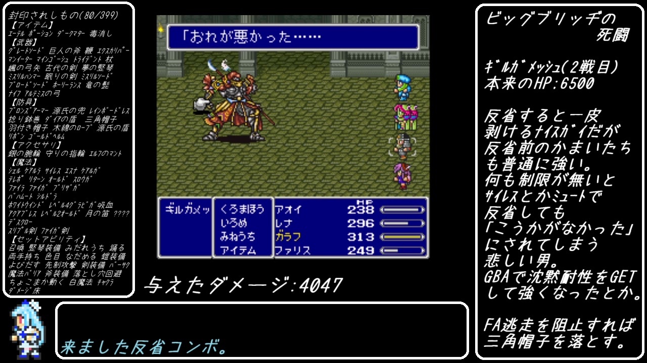 葵「なんか、うん、お疲れ様?」<br>茜「正直途中で辞めようと思ったけど、それはそれで悔しくてな」<br>葵「変に拘ると大変、身をもって学んだね……」<br><br>※茜ちゃんはこの動画ではちょっと頑張ってます。<br><br>※動画出力の方法を戻したら行間の処理が異なっていたらしく、途中左枠がはみ出てます……<br>Aviutl経由したら変わるんですねぇ(<br><br>【縛りのルール】<br>①キャラクターのLvUP、ジョブLvUPで封印対象からランダムに一つ封印<br>②時間制限イベント中に①を満たした場合、イベント終了後に一斉封印<br>③全滅した場合は封印状態を引き継ぎ、直前のセーブポイントから再開<br>④一度倒した敵からのみ逃走可。倒したことが無い敵が含まれるグループは逃走不可<br>⑤宝箱は100%回収<br>⑥調合は最後の手段(他の手段で倒せないときのみ解禁)<br>⑦編集はがんばらない<s>けどそれ以外が頑張り過ぎたので次回は力抜きます。</s><br><br>【補足】<br>・召喚獣とか魔法は揃うと限らないので収集しません(使う分だけ集める)<br>・縛りプレイは青魔道士縛りとか数回やった程度です<br>・アビリティの封印は「セットする」ことの封印、最初からセットされてるコマンドは使用可とする<br>(ジョブのコマンドがランダムになってるランダマイザー要素を残すための措置)<br><br>シリーズの動画 <a href="https://www.nicovideo.jp/mylist/70945380" target="_blank" rel="noopener">mylist/70945380</a><br><a href="https://www.nicovideo.jp/watch/sm38876887" class="watch">sm38876887</a> ←前 次→ <a href="https://www.nicovideo.jp/watch/sm38996315" class="watch">sm38996315</a><br><br>【すぺしゃるさんくす】<br>ルールの参考<s>(ほぼパクり)</s>にさせていただいたFF5ランダム封印先行者様 <a href="https://www.nicovideo.jp/watch/sm38408580" class="watch">sm38408580</a><br>ランダム封印縛りを流行らせた先行者様 <a href="https://www.nicovideo.jp/watch/sm37350612" class="watch">sm37350612</a><br>ランダマイザーの先行者様 <a href="https://www.nicovideo.jp/watch/sm38286234" class="watch">sm38286234</a><br>KotonoSync( <a href="https://www.nicovideo.jp/watch/sm29541659" class="watch">sm29541659</a> )およびKotonoTone( <a href="https://www.nicovideo.jp/watch/sm31817987" class="watch">sm31817987</a> )を活用させていただきました。<br>