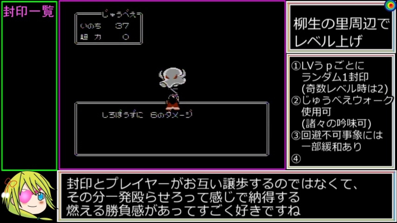 つながるひろがるじゅうべえの輪!<br>ステキなランダム封印縛り、オンエアー!<br><br>☆縛り内容☆<br>①レベルアップごとに超力・剣技・アイテム・装備が封印(奇数レベルになったら2封印)<br>②じゅうべえウォーク可(逃走および雑魚吟味、ボス戦で負けてリセットも可)<br>③システム上回避不可事項については緩和措置あり<br>④経験値の絡んだリセット禁止(ドロップを見てからのリセット)<br>⑤編集は頑張らない(やりたいようにはやる)<br><br>☆備考(上記③の詳細含む)☆<br>・装備変更不可時に装備物が封印された場合、代わりに1封印捧げて以降の使用を可とする(任意)<br>・封印済み装備の下取り代不問<br>・封印されたロバロバの中身チェックは江戸到達時と必須戦闘時のみとする<br>・露骨な難易度破壊は禁止(げんない解禁時点で封印前に30万両錬金しておく等)<br>・連戦時は最後にまとめて封印を行う<br>・その他諸々は基本テンポ重視、面白さ重視で<br><br>リスペクト元動画→<a href="https://www.nicovideo.jp/watch/sm37350612" class="watch">sm37350612</a><br>重要度表記とか参考にさせてもらってます→<a href="https://www.nicovideo.jp/watch/sm38385314" class="watch">sm38385314</a><br><br>次→<a href="https://www.nicovideo.jp/watch/sm38934296" class="watch">sm38934296</a>