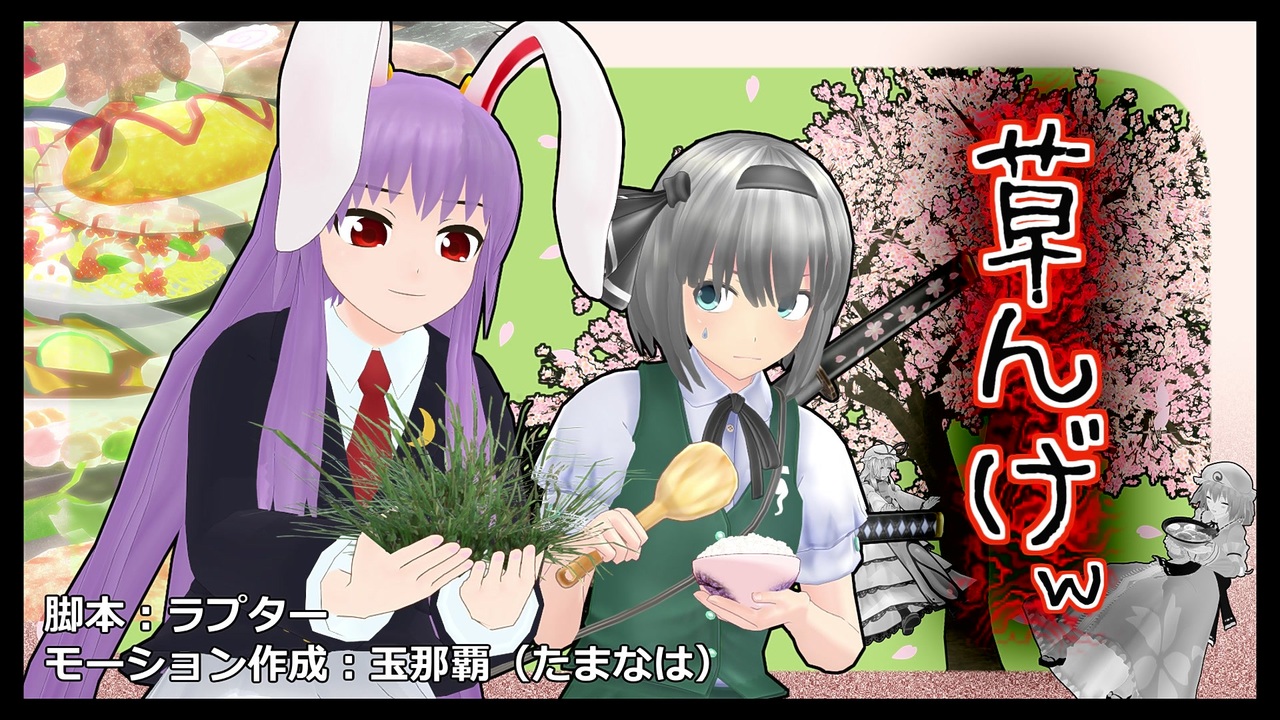 <span style="color: #262626;"><strong>脚本</strong></span><strong>:</strong><span style="color: #262626;"><strong>ラプター</strong></span><br><strong>モーション作成:玉那覇(たまなは)</strong><br><br>今回は玉那覇(たまなは)さんとの合作になります。<br>ギャグ物となっております。<br>Cパートもあります。<br>みんな、<span style="color: #262626;">草</span>を生やしていってね <br><br><span style="color: #ff0000;"><strong><u>YouTube</u></strong></span>の方でも投稿しております→<a href="https://youtu.be/wL-hmXoojq8" target="_blank" rel="noopener nofollow">https://youtu.be/wL-hmXoojq8</a><br><br>マイリスト→<a href="https://www.nicovideo.jp/mylist/55400054" target="_blank" rel="noopener">mylist/55400054</a><br><span style="color: #0000ff;">Twitter</span>→<a href="https://twitter.com/Raptor7024" target="_blank" rel="noopener nofollow">https://twitter.com/Raptor7024</a><br>(動画の進捗など、偶につぶやいてます)<br><br>_____________________<br><strong><u>玉那覇(たまなは)さんより</u></strong><br><br>楽しい動画になるよう草を食べながら作りました よろしくお願いします!<br><br>玉那覇さんのニコニコアカウント→<a href="https://www.nicovideo.jp/user/18982329" target="_blank" rel="noopener">user/18982329</a><br>マイリスト→<a href="https://www.nicovideo.jp/mylist/58421316" target="_blank" rel="noopener">mylist/58421316</a><br>youtube→<a href="https://www.youtube.com/channel/UCCdSpn17KuRJvUR8bNY2LAw" target="_blank" rel="noopener nofollow">https://www.youtube.com/channel/UCCdSpn17KuRJvUR8bNY2LAw</a><br><span style="color: #0000ff;">Twitter</span>→<a href="https://twitter.com/tama_078" target="_blank" rel="noopener nofollow">https://twitter.com/tama_078</a>