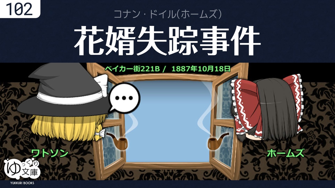 <span style="color: #ff0000;"><strong>102 ありふれた、特殊な事件──</strong></span><br>メアリー嬢の依頼は、結婚式当日に消えた恋人・エンジェル氏を探すことだった。しかしエンジェル氏は素性も人相もさだかではない。ホームズは2通の手紙を投函した。<br>別題:「同一事件」「花婿の正体」「消えた花婿」「花婿の行方」「ふきかえ事件」「紛失の花婿」「妻の連子」「人非人」「同人事件の探偵譚」など。<br><span style="color: green;">A Case Of Identity (1981) by Arthur Conan Doyle</span><br><br>(うp主より)原作はいろいろ深読みできるんだけど、気軽に楽しめる1本に翻案。次回予告は本編の楽しみを損ねてしまうかな。今後つづけるわけじゃないけど。<br>編集後記:<a href="https://trynext.com/story/ybook/yb102.php" target="_blank" rel="noopener nofollow">https://trynext.com/story/ybook/yb102.php</a><br><br>●ゆっくりホームズ <a href="https://www.nicovideo.jp/mylist/44188743" target="_blank" rel="noopener">mylist/44188743</a><br><a href="https://www.nicovideo.jp/watch/sm22450907" class="watch">sm22450907</a> 青い紅玉<br><a href="https://www.nicovideo.jp/watch/sm22787351" class="watch">sm22787351</a> ボヘミアの醜聞<br><a href="https://www.nicovideo.jp/watch/sm23572552" class="watch">sm23572552</a> ブルースパーティントン設計書<br><a href="https://www.nicovideo.jp/watch/sm24396455" class="watch">sm24396455</a> 赤毛連盟<br><a href="https://www.nicovideo.jp/watch/sm25669536" class="watch">sm25669536</a> 最後の事件<br><a href="https://www.nicovideo.jp/watch/sm25736285" class="watch">sm25736285</a> 最後の事件 ※ホームズ視点<br><a href="https://www.nicovideo.jp/watch/sm27909988" class="watch">sm27909988</a> 空き家の冒険<br><a href="https://www.nicovideo.jp/watch/sm27922359" class="watch">sm27922359</a> 踊る人形<br><a href="https://www.nicovideo.jp/watch/sm29638118" class="watch">sm29638118</a> 六つのナポレオン<br><a href="https://www.nicovideo.jp/watch/sm31456235" class="watch">sm31456235</a> 緋色の研究 (1/3)<br><a href="https://www.nicovideo.jp/watch/sm31457579" class="watch">sm31457579</a> 緋色の研究 (2/3)<br><a href="https://www.nicovideo.jp/watch/sm31457663" class="watch">sm31457663</a> 緋色の研究 (3/3)<br><a href="https://www.nicovideo.jp/watch/sm33822819" class="watch">sm33822819</a> 犯人は二人<br><a href="https://www.nicovideo.jp/watch/sm35784951" class="watch">sm35784951</a> 銀星号事件 (1/2)<br><a href="https://www.nicovideo.jp/watch/sm35789559" class="watch">sm35789559</a> 銀星号事件 (2/2)<br><a href="https://www.nicovideo.jp/watch/sm38943588" class="watch">sm38943588</a> <span style="color: #ff00ff;"><strong>花婿失踪事件</strong></span><br><a href="https://www.nicovideo.jp/watch/sm40101123" class="watch">sm40101123</a> 修道院屋敷<br><a href="https://www.nicovideo.jp/watch/sm40132626" class="watch">sm40132626</a> ワトソンの推理法修行<br><a href="https://www.nicovideo.jp/watch/sm40349456" class="watch">sm40349456</a> ホムワトの語らい<br><a href="https://www.nicovideo.jp/watch/sm42837925" class="watch">sm42837925</a> 1分でわかるホームズ<br><a href="https://www.nicovideo.jp/watch/sm44486463" class="watch">sm44486463</a> 熱いところをもらおうか<br><a href="https://www.nicovideo.jp/watch/sm44917708" class="watch">sm44917708</a> ソア橋<br><br>●ゆっくり文庫について<br>全部:<a href="https://www.nicovideo.jp/mylist/74874627" target="_blank" rel="noopener">mylist/74874627</a><br>近況:<a href="https://twitter.com/trynext" target="_blank" rel="noopener nofollow">https://twitter.com/trynext</a><br>---<br>