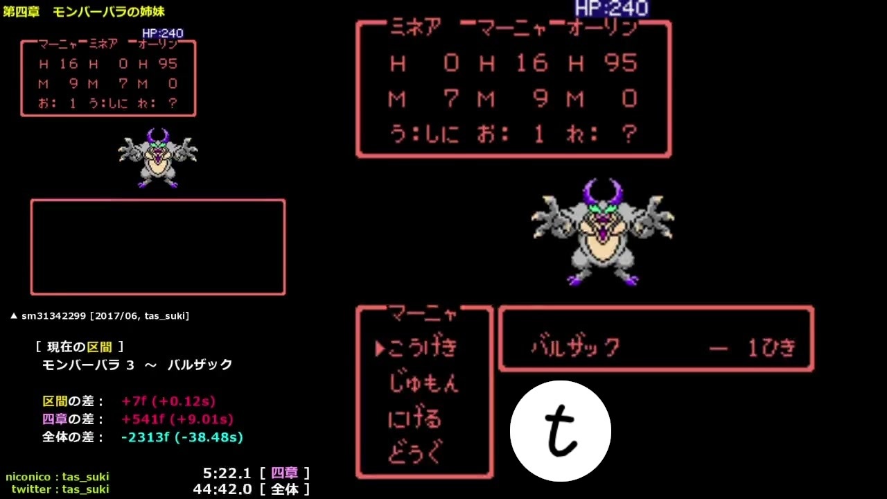 第四章は 10秒近く縮まりました。(嬉しい)<br><br><br>FC ドラゴンクエスト4(ドラクエ4, DQ4)導かれし者たち のTASの試走です。<br><br>前回の TAS (<a href="https://www.nicovideo.jp/watch/sm31342299" class="watch">sm31342299</a>, <strong>tas_suki</strong>, 2017/06) とほとんど同様の手順ですが、<br>いろいろ最適化したらこのパートは 597f (9.93s) 短縮できました。(嬉しい)<br><br>第四章の終了時点で 57.42秒くらい (3451f) 縮まり、<br>全体で1分以上短縮できそうな気がしてきました。(嬉しい)<br><br><br>フレーム数[総] : 31584f [173411f]<br>追記数[総] : 31369 [543076]<br><br><br>3/7 第三章 → <a href="https://www.nicovideo.jp/watch/sm38641936" class="watch">sm38641936</a><br>5/7 第五章 1/3 → (まだ山奥の村を出たところ)<br><br><br>[過去に投稿した主な ド◯◯◯ の TAS]<br><a href="https://www.nicovideo.jp/watch/sm38514046" class="watch">sm38514046</a> GBC ドラゴンクエスト1<br><a href="https://www.nicovideo.jp/watch/sm38806719" class="watch">sm38806719</a> GBC ドラゴンクエスト2<br><a href="https://www.nicovideo.jp/watch/sm33886362" class="watch">sm33886362</a> FC MUSIC TYPE FEVER<br><br><span style="color: #45818e; font-size: 10px;">この動画で利用している株式会社スクウェア・エニックスを代表とする共同著作者が権利を所有する著作物及びスギヤマ工房有限会社が権利を所有する楽曲の転載・配布は禁止いたします。<br> © 1990 ARMOR PROJECT/BIRD STUDIO/SPIKE CHUNSOFT/SQUARE ENIX All Rights Reserved.<br> © SUGIYAMA KOBO</span><br><br /><br>------------- 以下 共通説明文 -------------<br><br><strong>PIXIV FANBOX や Amazon にて支援を募っています。よかったらぜひ。<br>FANBOX : <a href="https://www.fanbox.cc/@tas-suki" target="_blank" rel="noopener nofollow">https://www.fanbox.cc/@tas-suki</a><br>Wish List : <a href="https://www.amazon.co.jp/hz/wishlist/ls/3M57V3BKOO1N9" target="_blank" rel="noopener nofollow">https://www.amazon.co.jp/hz/wishlist/ls/3M57V3BKOO1N9</a></strong><br><br><strong>twitter : <a href="https://twitter.com/tas_suki" target="_blank" rel="noopener nofollow">https://twitter.com/tas_suki</a><br>RTA : <a href="https://www.speedrun.com/user/tas_suki" target="_blank" rel="noopener nofollow">https://www.speedrun.com/user/tas_suki</a></strong><br><br><span style="color: #20124d;"><strong>※ 2021/10 以降は、不定期に動画を投稿しています。</strong></span><br><br> ・Posted TASes (recently)<br>05/31 <a href="https://www.nicovideo.jp/watch/sm42293404" class="watch">sm42293404</a> (PC)<br>04/30 <a href="https://www.nicovideo.jp/watch/sm42136556" class="watch">sm42136556</a> (PC)<br>02/28 <a href="https://www.nicovideo.jp/watch/sm41812217" class="watch">sm41812217</a> (MD)<br>12/25 <a href="https://www.nicovideo.jp/watch/sm41553821" class="watch">sm41553821</a> (PC)<br>11/08 <a href="https://www.youtube.com/watch?v=Lj6N0bm3lyo" target="_blank" rel="noopener nofollow">https://www.youtube.com/watch?v=Lj6N0bm3lyo</a> (PC)<br>09/29 <a href="https://www.youtube.com/watch?v=gRelRaVcyQg" target="_blank" rel="noopener nofollow">https://www.youtube.com/watch?v=gRelRaVcyQg</a> (PC)<br>07/01 <a href="https://www.youtube.com/watch?v=28G366IdmPE" target="_blank" rel="noopener nofollow">https://www.youtube.com/watch?v=28G366IdmPE</a> (PC)<br>05/31 <a href="https://www.nicovideo.jp/watch/sm40538452" class="watch">sm40538452</a> (PC)<br><br> ・Posted TASes (2016/04 ~ )<br><a href="http://www.nicovideo.jp/user/56935712/video" target="_blank" rel="noopener nofollow">http://www.nicovideo.jp/user/56935712/video</a><br><br> ・Posted TASes that are the current fastest records<br><a href="https://www.nicovideo.jp/series/74250" target="_blank" rel="noopener nofollow">https://www.nicovideo.jp/series/74250</a>