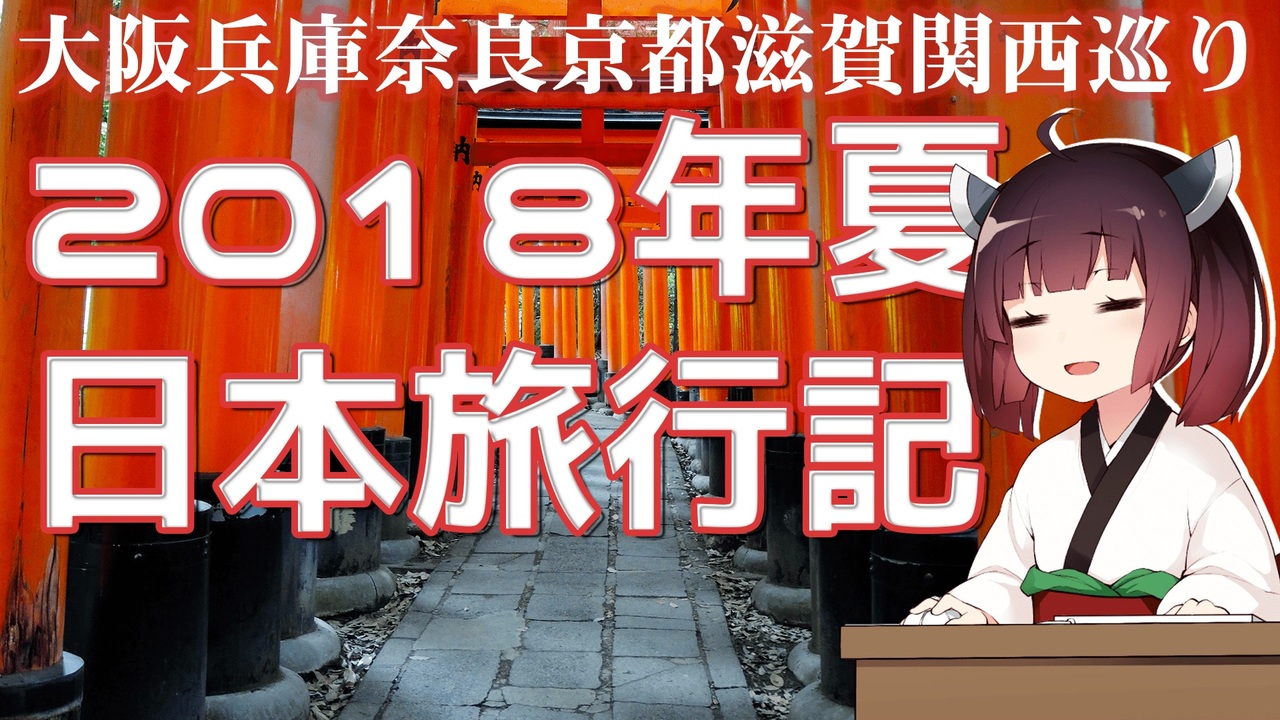 この動画は2018年06月11日から2018年06月23日までの旅の要点記録のみ。<br> <br>路線は大阪→兵庫(西宮、神戸)→奈良(橿原)→京都(宇治、嵐山)→滋賀(大津)。<br> <br>この旅で聖地巡礼したアニメは主に『涼宮ハルヒの憂鬱』、『Fate』、『境界の彼方』、『りゅうおうのおしごと!』、『咲-saki-全国編』、『中二病でも恋がしたい!』、『響け!ユーフォニアム』、『たまこまーけっと』、『ちはやふる』、『けいおん!』です。それと『さくら荘のペットな彼女』、『ゆるゆり』、『競女!!!!!!!!』、『ソードアート・オンライン』、『偽物語』、『冴えない彼女の育てかた』、『四畳半神話大系』、『やはり俺の青春ラブコメはまちがっている。』、ゲーム『龍が如く』のぷち巡礼も含まれていますが、動画ではほぼ省略されました。<br><br><span style="color: #ff0000;">20210708追記:</span>宇治第一ホテルの宿代は現地決済だった。<br><br>Youtube→<a href="https://www.youtube.com/watch?v=lfMI_MvdO4w" target="_blank" rel="noopener nofollow">https://www.youtube.com/watch?v=lfMI_MvdO4w</a><br>Niconico→<a href="https://www.nicovideo.jp/watch/sm38967163" target="_blank" rel="noopener nofollow">https://www.nicovideo.jp/watch/sm38967163</a><br><br>2015年の日本旅行→<a href="https://www.nicovideo.jp/watch/sm38904087" class="watch">sm38904087</a><br>2017年の日本旅行→<a href="https://www.nicovideo.jp/watch/sm38929137" class="watch">sm38929137</a><br>2018年夏の日本旅行→ここ<br>2018年冬の日本旅行→<a href="https://www.nicovideo.jp/watch/sm39007437" class="watch">sm39007437</a><br><br>Illustration:<br>東北きりたん_座ってる立ち絵素材(ふゆきさん)<br>いらすとや<br> <br>Music:<br>Canon in D Major(Kevin MacLeodさん)<br><br>|ボロボロ日本語シリーズ|<br><i><a href="https://www.nicovideo.jp/mylist/69207343" target="_blank" rel="noopener">mylist/69207343</a></i>
