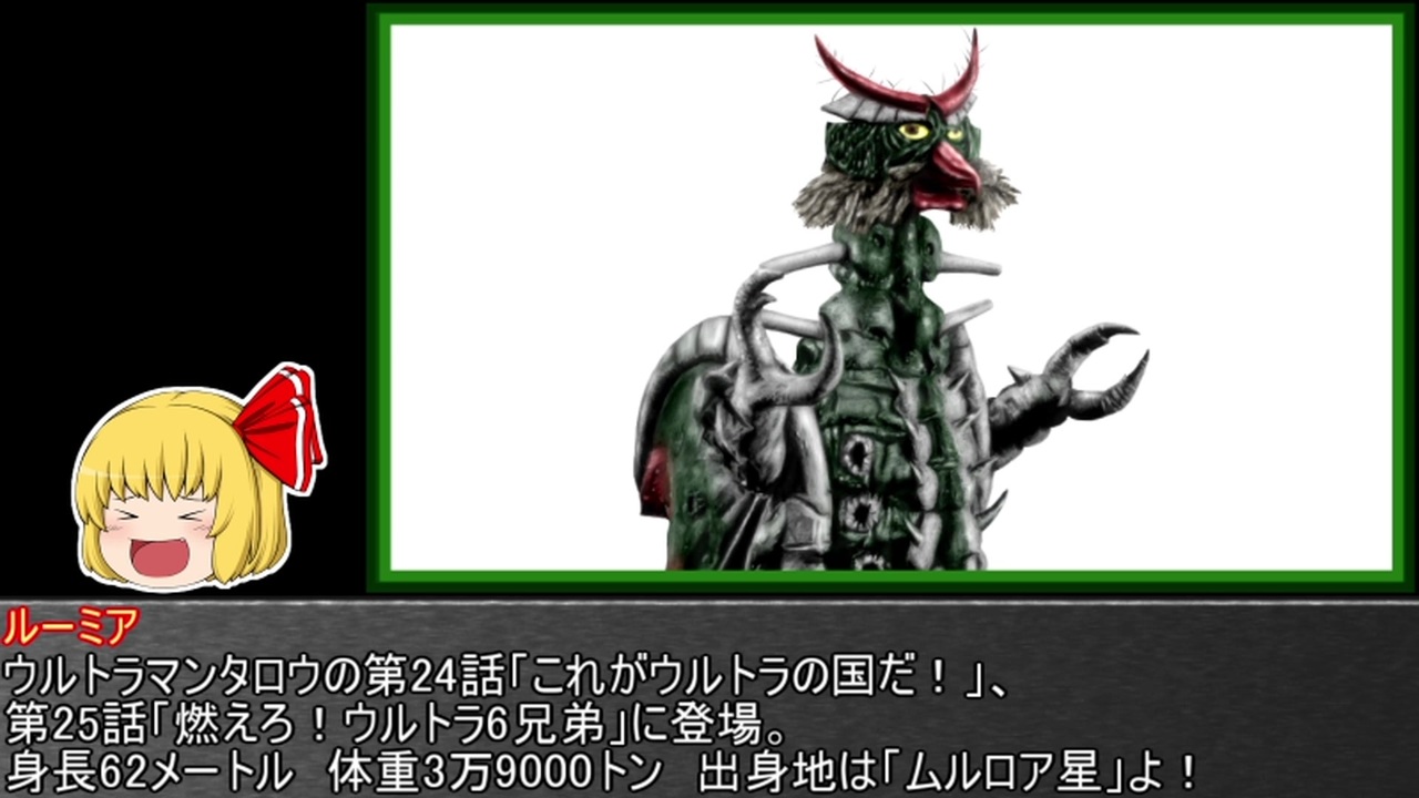 今回はウルトラマンタロウより「宇宙大怪獣 ムルロア」、「宇宙蛾 スペースモス」、「宇宙犬 ラビドッグ」をご紹介。<br>久々にアレもやっている回です。<br><br><a href="https://www.nicovideo.jp/watch/sm38905351" class="watch">sm38905351</a>←前 次→<a href="https://www.nicovideo.jp/watch/sm39151798" class="watch">sm39151798</a><br>マイリスト→<a href="https://www.nicovideo.jp/mylist/36883720" target="_blank" rel="noopener">mylist/36883720</a> 動画用イラスト→<a href="https://seiga.nicovideo.jp/clip/880468" target="_blank" rel="noopener">clip/880468</a><br><br>◆その他企画◆<br>ゆっくり霊夢とやる夫が学ぶ ウルトラ怪獣大百科(SS版)→<a href="https://ch.nicovideo.jp/article/ar214243" target="_blank" rel="noopener">ar214243</a><br>昆虫やゴジラなど他のシリーズは、このマイリスからどうぞ→<a href="https://www.nicovideo.jp/mylist/39889181" target="_blank" rel="noopener">mylist/39889181</a><br>生放送とかをやっている怪獣コミュニティ→co1805608