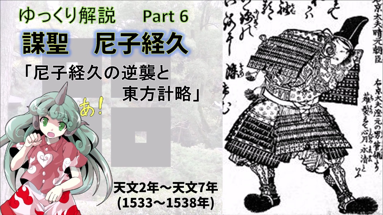 <span style="font-size: 24px;">山名・赤松・細川「尼子絶対許さん」</span><br><br>前回「尼子経久part5」;<a href="https://www.nicovideo.jp/watch/sm38908075" class="watch">sm38908075</a><br>次回「尼子経久part7(最終回)」;<a href="https://www.nicovideo.jp/watch/sm39043431" class="watch">sm39043431</a><br><br>初めまして、実は本業の方で本を出版したことがあるしかかくです。<br>今回は塩冶興久の乱を乗り越えた尼子経久の逆襲と、尼子家の上洛運動について解説いたします。<br>この頃から尼子経久は一戦を引き、孫の尼子晴久が当主として動き始めますが、幕府からの奉書には大体尼子経久の名前も一緒に書かれており、完全に隠居したわけではないことがわかります。<br><br>YouTube; <a href="https://www.youtube.com/channel/UCRyZjTeQgxd8iXcL2P8vwNA" target="_blank" rel="noopener nofollow">https://www.youtube.com/channel/UCRyZjTeQgxd8iXcL2P8vwNA</a><br>Twitter; <a href="https://twitter.com/SquareDeerHorn" target="_blank" rel="noopener nofollow">https://twitter.com/SquareDeerHorn</a><br><br><br>参考文献<br>「岡山県中世城館跡総合調査報告書」<br>「中世川本・石見小笠原氏関連史料集」<br>米原正義 『大内義隆 : 名称が花開かせた山口文化』<br>木下昌規 『足利義晴と機内動乱:分裂した将軍家』<br>市川裕士編『山陰山名氏』<br>長谷川博史『大内氏の興亡と西日本社会』<br>山本浩樹 『西国の戦国合戦』<br>佐伯徳哉 『出雲の中世: 地域と国家のはざま』<br>岸田裕之 『毛利元就~武威天下無双、下民憐愍の文徳は未だ』<br>河村昭一 『安芸武田氏』<br>河合正治 『安芸毛利一族』<br>米原正義 『出雲尼子一族』<br>岸田裕之 「大名領国の構成的展開」<br>松浦義則 「戦国大名の領主層掌握についてー出雲尼子氏を例として」<br>今岡典和 「戦国期の守護権カ - 出雲尼子氏を素材として」<br>川岡勉 「尼子氏による出雲国成敗権掌握」<br>原慶三 「尼子氏の石見進出をめぐって」<br>岡村吉彦 「総論-戦国時代の伯耆地域における戦乱史」<br>鳥取県編 「尼子氏と戦国時代の鳥取」