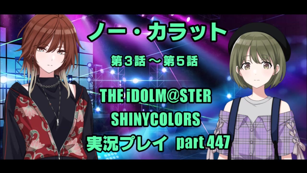 今回はイベントコミュの【00-ct.ノー・カラット】を第3話から第5話まで鑑賞します。<br><br>本編中は雰囲気に飲まれてあまり喋っておりませんが、最後の感想パートではたっぷりお話しする予定です。<br><br>あと、だいたい全体の尺調整ができたので、今後の予定を簡単に記載しておきます!<br> Part448 第6話・エンディング<br> Part449 S-SSR・全体通しての感想<br> Part450 ガシャ<br><br> 前回 → <a href="https://www.nicovideo.jp/watch/sm38982109" class="watch">sm38982109</a><br> 次回 → <a href="https://www.nicovideo.jp/watch/sm38993306" class="watch">sm38993306</a><br><br> コミュニティ → co3766379 <br> シャニマス マイリスト → ① <a href="https://www.nicovideo.jp/mylist/61820967" target="_blank" rel="noopener">mylist/61820967</a><br> ② <a href="https://www.nicovideo.jp/mylist/71459810" target="_blank" rel="noopener">mylist/71459810</a><br><br>【動画説明】<br>・THE IDOLM@STER SHINYCOLORSを実況しながら遊んでみました。<br>・このゲーム実況は「アイドルマスター シャイニーカラーズ ゲーム実況ポリシー」<br> <a href="https://shinycolors.idolmaster.jp/game_commentary_policy/" target="_blank" rel="noopener nofollow">https://shinycolors.idolmaster.jp/game_commentary_policy/</a><br> に基づき制作・配信されています。<br>・本動画にはゲームシナリオ・コミュのネタバレが含まれます。<br> ネタバレが嫌な方は、ご視聴はお控えください。<br>・本動画には、雑な声真似、アテレコ、茶番、奇声、妄想等が含まれます。<br> 苦手な方、許容できない方は、ご視聴をご遠慮願います。<br> また、他者を不快にするコメントはご遠慮願います。<br>・誤った知識や適当な発言があるかと思いますが、やんわりとご指摘頂ければ助かります。<br>・ツイッター: <a href="https://twitter.com/midvalley_midon" target="_blank" rel="noopener nofollow">https://twitter.com/midvalley_midon</a> (更新報告など)<br>