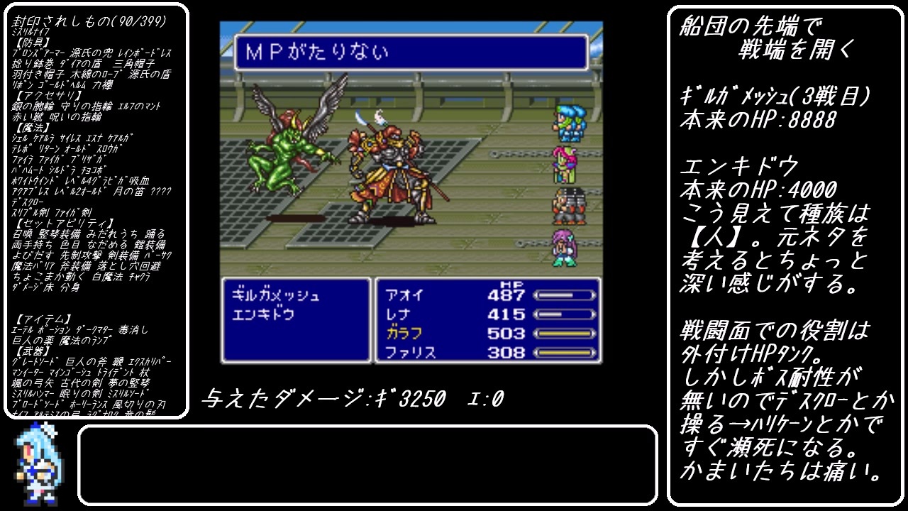 茜「そろそろ封印100も目前やな」<br>葵「なんだか思ってたよりは余裕あるんだよね(リボンから目をそらしながら)」<br>茜「そういうのフラグっていうんやで」<br><br>※茜ちゃんはこの動画には登場しません<br><br><br>【縛りのルール】<br>①キャラクターのLvUP、ジョブLvUPで封印対象からランダムに一つ封印<br>②時間制限イベント中に①を満たした場合、イベント終了後に一斉封印<br>③全滅した場合は封印状態を引き継ぎ、直前のセーブポイントから再開<br>④一度倒した敵からのみ逃走可。倒したことが無い敵が含まれるグループは逃走不可<br>⑤宝箱は100%回収<br>⑥調合は最後の手段(他の手段で倒せないときのみ解禁)<br>⑦編集はちからぬいた。<br><br>【補足】<br>・召喚獣とか魔法は揃うと限らないので収集しません(使う分だけ集める)<br>・縛りプレイは青魔道士縛りとか数回やった程度です<br>・アビリティの封印は「セットする」ことの封印、最初からセットされてるコマンドは使用可とする<br>(ジョブのコマンドがランダムになってるランダマイザー要素を残すための措置)<br><br>シリーズの動画 <a href="https://www.nicovideo.jp/mylist/70945380" target="_blank" rel="noopener">mylist/70945380</a><br><a href="https://www.nicovideo.jp/watch/sm38923753" class="watch">sm38923753</a> ←前 次→<a href="https://www.nicovideo.jp/watch/sm39031418" class="watch">sm39031418</a>(お詫び回)<br><br>【すぺしゃるさんくす】<br>ルールの参考<s>(ほぼパクり)</s>にさせていただいたFF5ランダム封印先行者様 <a href="https://www.nicovideo.jp/watch/sm38408580" class="watch">sm38408580</a><br>ランダム封印縛りを流行らせた先行者様 <a href="https://www.nicovideo.jp/watch/sm37350612" class="watch">sm37350612</a><br>ランダマイザーの先行者様 <a href="https://www.nicovideo.jp/watch/sm38286234" class="watch">sm38286234</a><br>動画中で紹介したFF5青魔道士縛りの先達 <a href="https://www.nicovideo.jp/watch/sm1574823" class="watch">sm1574823</a>