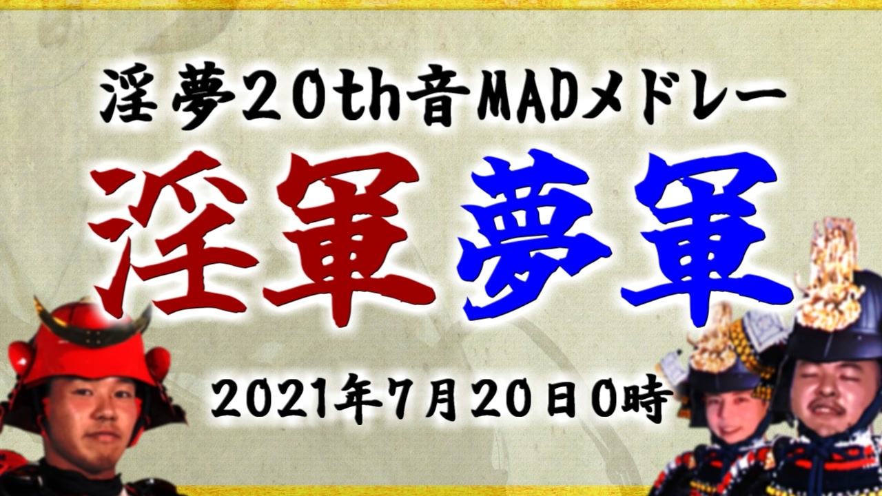 <span style="font-size: 24px;"><strong>【2021/7/20追記】<br>投稿しました。入って、どうぞ</strong></span><br><span style="color: #ff0000; font-size: 24px;"><strong>淫軍</strong></span><span style="font-size: 24px;"><strong>→<a href="https://www.nicovideo.jp/watch/sm39046938" class="watch">sm39046938</a></strong></span><br><span style="color: #0000ff; font-size: 24px;"><strong>夢軍</strong></span><span style="font-size: 24px;"><strong>→<a href="https://www.nicovideo.jp/watch/sm39054936" class="watch">sm39054936</a></strong></span><br><br>---------------------------------------------------------------------------------<br><br><span style="font-size: 24px;"><strong>淫夢20th音MADメドレー</strong></span><span style="color: #ff0000; font-size: 24px;"><strong>「淫軍」</strong></span><span style="color: #0000ff; font-size: 24px;"><strong>「夢軍」</strong></span><span style="font-size: 24px;"><strong>の合作告知動画です。</strong></span><br><br><span style="font-size: 18px;"><strong>第2弾CM→<a href="https://www.nicovideo.jp/watch/sm39036884" class="watch">sm39036884</a></strong></span><br><br>CM制作:アンデス(<a href="https://www.nicovideo.jp/user/47716345" target="_blank" rel="noopener">user/47716345</a>)<br><br><br><span style="font-size: 16px;">◆今後の主な予定</span><br><br>7/19 22:00~ 音MAD企画 先行公開イベント<br>7/20 0:00~ 全合作を公開<br><br><br><span style="font-size: 16px;">◆合作情報は以下をご確認ください</span><br><br>Twitter:<a href="https://twitter.com/inm20thofficial" target="_blank" rel="noopener nofollow">https://twitter.com/inm20thofficial</a><br>