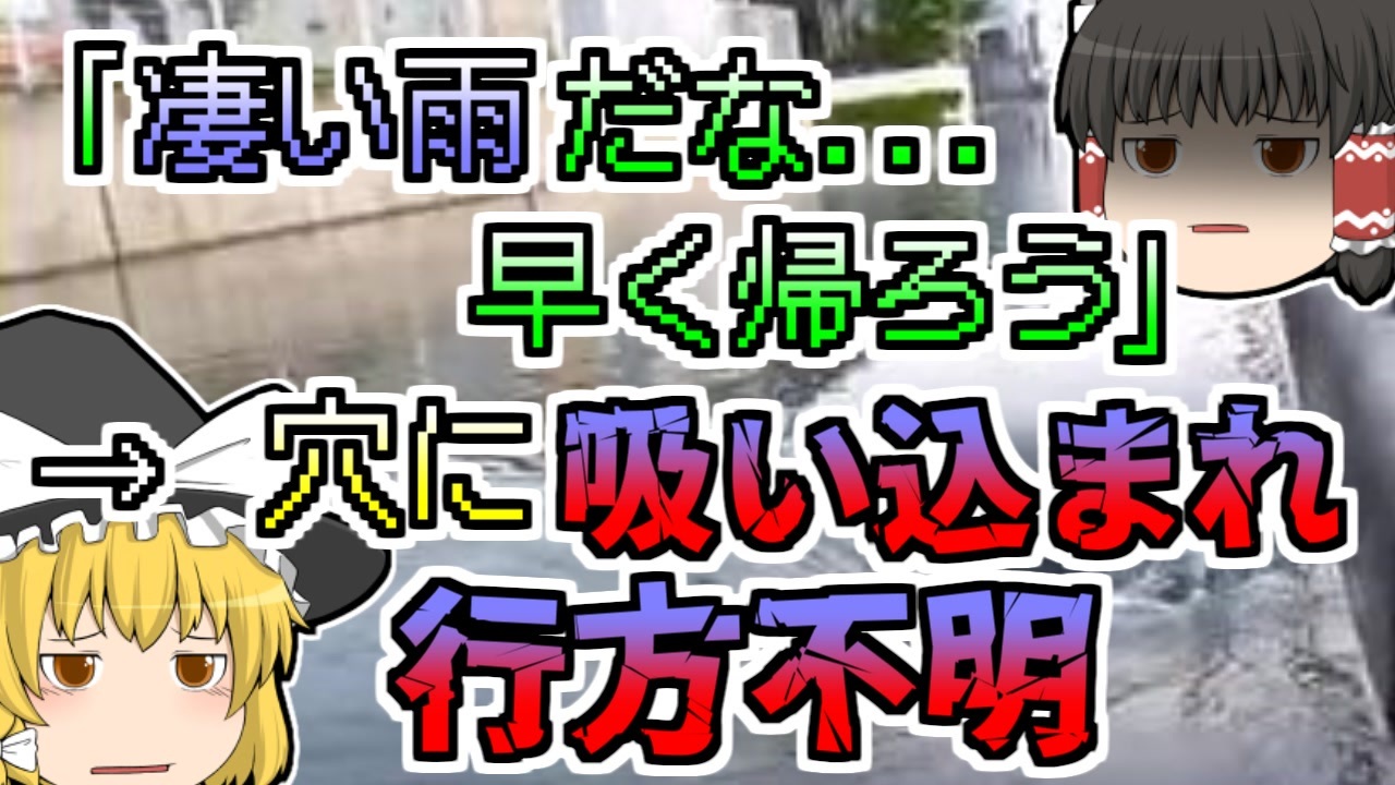 今回は、リクエストがありました『豪雨マンホール転落』の紹介です。<br>季節的にも丁度イイと思い、取り上げました。<br><br>冠水した道路を通行していた人たちは、開いていたマンホールの穴に気付かず、吸い込まれてしまったり、躓いたりと、小さな事故が都内で多発していました。<br>中には自転車ごと吸い込まれて溺れてしまい、翌日まで発見されなかった人まで居ました。<br><br>都内に設置されていたマンホールは、約30万以上。<br>この事故を契機に、その全てのマンホールが調査され、危険箇所については改良型の蓋を設置するなど、大規模な対策が取られました。<br><br><br><br>引用:出典:参考<br>Wikipedia<br><a href="https://ishort.ink/jdG8" target="_blank" rel="noopener nofollow">https://ishort.ink/jdG8</a><br>三井住友海上<br><a href="https://ishort.ink/uxAJ" target="_blank" rel="noopener nofollow">https://ishort.ink/uxAJ</a><br>Yahoo!ニュース<br><a href="https://ishort.ink/qdyJ" target="_blank" rel="noopener nofollow">https://ishort.ink/qdyJ</a><br>ウェザーニュース<br><a href="https://ishort.ink/Z2tt" target="_blank" rel="noopener nofollow">https://ishort.ink/Z2tt</a><br>琉球新報<br><a href="https://ishort.ink/BDvW" target="_blank" rel="noopener nofollow">https://ishort.ink/BDvW</a><br>国土交通省<br><a href="https://ishort.ink/yCzV" target="_blank" rel="noopener nofollow">https://ishort.ink/yCzV</a><br>茨城県<br><a href="https://ishort.ink/pjt2" target="_blank" rel="noopener nofollow">https://ishort.ink/pjt2</a><br>エスロンタイムズ<br><a href="https://ishort.ink/97cd" target="_blank" rel="noopener nofollow">https://ishort.ink/97cd</a><br>株式会社イトーヨーギョー<br><a href="https://ishort.ink/m9J2" target="_blank" rel="noopener nofollow">https://ishort.ink/m9J2</a><br />※この動画は過去の事件を知り、現在でも同じことが発生する危険性を再認識、関与しないように促すための動画であり、視聴者を扇動、動揺を誘うためのコンテンツではありません。<br><br>ご要望にお応えして、メンバーシップの開設を行いました。<br>下記URLからも登録可能ですので、ご興味がある方は是非ご参加ください。<br><a href="https://www.youtube.com/channel/UCcT5a1J7XJW7CLYI2RKl4pw/join" target="_blank" rel="noopener nofollow">https://www.youtube.com/channel/UCcT5a1J7XJW7CLYI2RKl4pw/join</a><br><br><br>Twitter<br>→<a href="https://twitter.com/yukkurisurutoko" target="_blank" rel="noopener nofollow">https://twitter.com/yukkurisurutoko</a><br><br>取り急ぎ、簡易的にですがマイリストを作りました。<br>【ゆっくり解説】事故・事件関係紹介リスト <br><a href="https://www.nicovideo.jp/mylist/71034319" target="_blank" rel="noopener nofollow">https://www.nicovideo.jp/mylist/71034319</a><br>【ゆっくり解説】放射線系事故<br><a href="https://www.nicovideo.jp/mylist/71034368" target="_blank" rel="noopener nofollow">https://www.nicovideo.jp/mylist/71034368</a><br>【ゆっくり解説】鉄道系事故・事件関連<br><a href="https://www.nicovideo.jp/mylist/71034379" target="_blank" rel="noopener nofollow">https://www.nicovideo.jp/mylist/71034379</a>