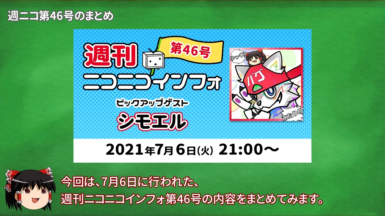 7月6日(火)放送の週刊ニコニコインフォ第46号(<a href="https://live.nicovideo.jp/watch/lv332447137" target="_blank" rel="noopener">lv332447137</a>)のまとめ動画です。<br><br>↓再生時間をクリックすると、それぞれのセクションに飛びます。<br><a href="#" class="seekTime" data-seekTime="00:33" onclick="seekNicoPlayer('#00:33'); return false;">#00:33</a> ゲームアツマール・マルチプレイゲーム投稿機能<br><a href="#" class="seekTime" data-seekTime="01:16" onclick="seekNicoPlayer('#01:16'); return false;">#01:16</a> ニコ動・応援月間<br><a href="#" class="seekTime" data-seekTime="01:48" onclick="seekNicoPlayer('#01:48'); return false;">#01:48</a> ニコ動・コメントサーバー引っ越し開始<br><a href="#" class="seekTime" data-seekTime="02:21" onclick="seekNicoPlayer('#02:21'); return false;">#02:21</a> ニコ動・予約投稿状態でも親作品登録可能に<br><a href="#" class="seekTime" data-seekTime="02:56" onclick="seekNicoPlayer('#02:56'); return false;">#02:56</a> 結婚相談所Ncon<br><br><a href="#" class="seekTime" data-seekTime="03:22" onclick="seekNicoPlayer('#03:22'); return false;">#03:22</a> ゲストからニコニコへ: シモエルさん<br><a href="#" class="seekTime" data-seekTime="04:37" onclick="seekNicoPlayer('#04:37'); return false;">#04:37</a> 次回予告<br><br>注意: この動画で紹介する内容は、動画投稿時点のものであり、また誤りを含む可能性があります。気づいた点があれば、ぜひコメントで補足してもらえると助かります。<br><br>公式運営生放送「週刊ニコニコインフォ」の過去のタイムシフト(<strong>いつでも誰でも視聴可</strong>)や、今後の放送予定などは、「週刊ニコニコインフォチャンネル」をチェック!<br><a href="https://ch.nicovideo.jp/weekly-niconico-info" target="_blank" rel="noopener nofollow">https://ch.nicovideo.jp/weekly-niconico-info</a><br><br>今回の週ニコをNFF中心にまとめた公式動画↓<br>ゲームアツマールのマルチプレイゲーム投稿機能について: <a href="https://www.nicovideo.jp/watch/so38995828" class="watch">so38995828</a><br>Nconについて: <a href="https://www.nicovideo.jp/watch/so38995851" class="watch">so38995851</a><br><br>今回の週ニコをまとめた公式のニュース記事はこちら↓<br><a href="https://originalnews.nico/323331" target="_blank" rel="noopener nofollow">https://originalnews.nico/323331</a><br><br>今回の週ニコをゲストコーナー中心にまとめた公式動画 → <a href="https://www.nicovideo.jp/watch/sm39038226" class="watch">sm39038226</a><br /><br>※関連動画や前後の動画へは、この説明文の下にある「シリーズ」機能から移動できます<br><span style="font-size: 18px;"><strong>Twitter → <a href="https://twitter.com/nikosai2531" target="_blank" rel="noopener nofollow">https://twitter.com/nikosai2531</a></strong></span><br>その他上げた動画 → <a href="https://www.nicovideo.jp/user/11543832/video" target="_blank" rel="noopener nofollow">https://www.nicovideo.jp/user/11543832/video</a>