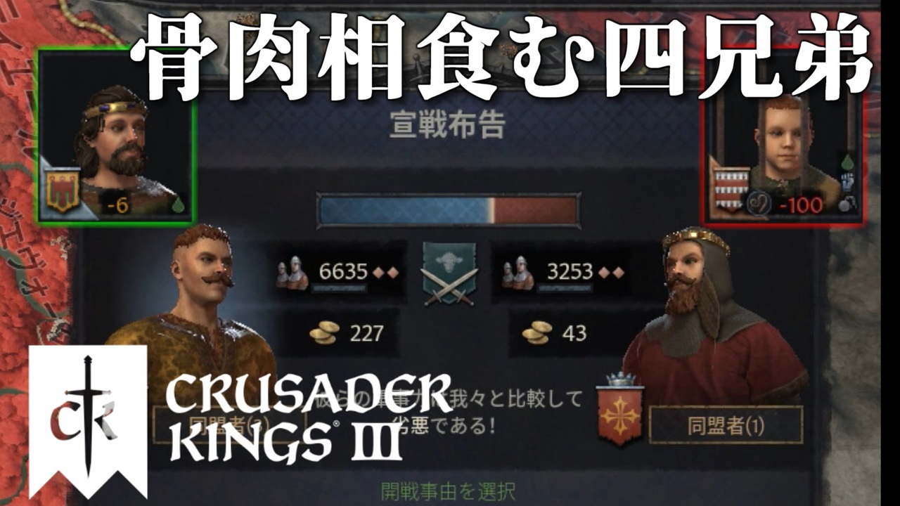 骨肉相食む四兄弟の巻<br>Ver1.44<br><span style="color: #ff0000;">Youtubeチャンネル:<a href="https://www.youtube.com/channel/UCIgzloQ_KfcUN_AcvlxtDdg" target="_blank" rel="noopener nofollow">https://www.youtube.com/channel/UCIgzloQ_KfcUN_AcvlxtDdg</a></span><br><span style="color: #0000ff;">Twitter:<a href="https://twitter.com/proffesor2sk" target="_blank" rel="noopener nofollow">https://twitter.com/proffesor2sk</a></span><br>※その他のプレイ講座はこちら:<a href="https://www.nicovideo.jp/mylist/34307950" target="_blank" rel="noopener">mylist/34307950</a><br>[Crusader Kings 3] Copylight © [2020] Paradox Interactive AB. www.paradoxplaza.com<br><br>使わせていただいた素材サイト<br>フォント:「M+」「装甲明朝」「たぬき油性マジック」「しねきゃぷしょん」「英雄行書」<br>効果音:「効果音ラボ」「効果音辞典」「OtoLogic」<br>BGM:<br>Nowhere Land by Alexander Nakarada | <a href="https://www.serpentsoundstudios.com" target="_blank" rel="noopener nofollow">https://www.serpentsoundstudios.com</a><br>Music promoted by <a href="https://www.free-stock-music.com" target="_blank" rel="noopener nofollow">https://www.free-stock-music.com</a><br>Attribution 4.0 International (CC BY 4.0)<br><a href="https://creativecommons.org/licenses/by/4.0/" target="_blank" rel="noopener nofollow">https://creativecommons.org/licenses/by/4.0/</a>