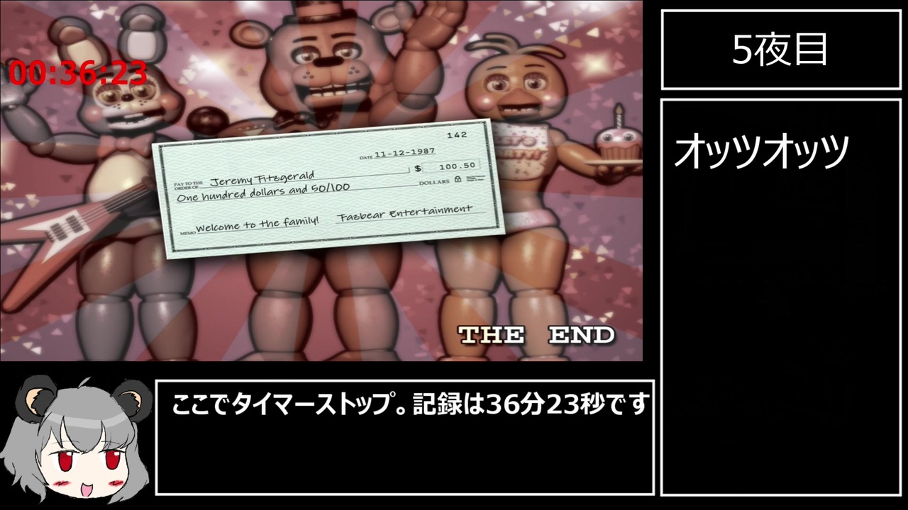 <span style="font-size: 18px;">次はもっとマトモなバイトをしよう…(一敗)</span><br>Five Nights at Freddy's2 通称FNAF2のany%RTAのpart4です<br>最後まで見てくださり本当にありがとうございます!<br><a href="https://www.nicovideo.jp/watch/sm39005200" class="watch">sm39005200</a>←前回 <br>自分自身まだFNAF全作品やっているわけではないので考察などはプレイした後になると思います<br>FNAF無印RTA part1→<a href="https://www.nicovideo.jp/watch/sm38838632" class="watch">sm38838632</a><br>Five Nights At Freddy's 2 - song→ <a href="https://www.youtube.com/watch?v=9dVkv-IjMV4" target="_blank" rel="noopener nofollow">https://www.youtube.com/watch?v=9dVkv-IjMV4</a><br />FNAF RTAマイリスト <a href="https://www.nicovideo.jp/mylist/71729876" target="_blank" rel="noopener">mylist/71729876</a><br>参考にさせていただいているWiki様→<a href="https://fnaf.swiki.jp/" target="_blank" rel="noopener nofollow">https://fnaf.swiki.jp/</a><br>Twitter→ <a href="https://twitter.com/shilviass" target="_blank" rel="noopener nofollow">https://twitter.com/shilviass</a><br>youtube→<a href="https://www.youtube.com/channel/UCmOIEb76TtHFbBYzMRQpAUQ" target="_blank" rel="noopener nofollow">https://www.youtube.com/channel/UCmOIEb76TtHFbBYzMRQpAUQ</a>
