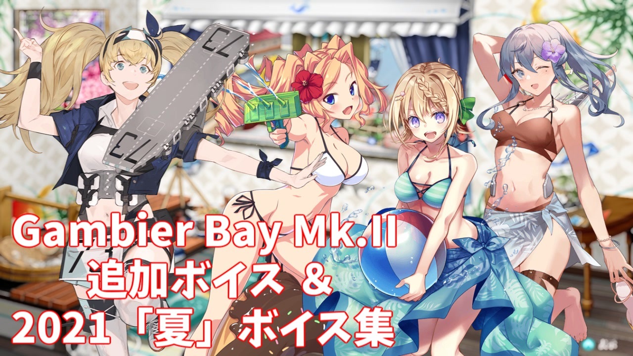 Gambier Bay Mk.IIの追加ボイスと、15隻の新規「夏」ボイス集です。<br>暑すぎ(>∞<)ベーイ<br><br><a href="#" class="seekTime" data-seekTime="00:04" onclick="seekNicoPlayer('#00:04'); return false;">#00:04</a> Gambier Bay Mk.II 追加ボイス<br><a href="#" class="seekTime" data-seekTime="01:26" onclick="seekNicoPlayer('#01:26'); return false;">#01:26</a> 限定ボイス 図鑑No.順<br>(Sheffield Honolulu 宗谷 Perth Helena 迅鯨 伊47 竹 桃 Scirocco Washington Northampton 巻波 涼波 伊203)<br><br>【新規絵】<br>(GambierBay Mk.II 加古 曙改二 龍鳳改二/戊 海風改二 GotlandAndra Honolulu 宗谷 Perth 迅鯨 竹 涼波 伊203)<br><br>前|高波改二 追加ボイス&2021「梅雨」ボイス集 (6/22アップデート) <a href="https://www.nicovideo.jp/watch/sm38932895" class="watch">sm38932895</a><br><strong>次|2021「夏」ボイス集② (8/4アップデート) </strong><a href="https://www.nicovideo.jp/watch/sm39134732" class="watch">sm39134732</a><br><br>艦これ追加ボイス集 マイリスト(<a href="https://www.nicovideo.jp/mylist/40513442" target="_blank" rel="noopener">mylist/40513442</a>)<br>シリーズ(<a href="https://www.nicovideo.jp/series/34200" target="_blank" rel="noopener">series/34200</a>)<br><br>Youtubeでも活動しています。<br>チャンネル <a href="https://www.youtube.com/channel/UCTYYB9O7hiQlH6Ee-Xxlbpg" target="_blank" rel="noopener nofollow">https://www.youtube.com/channel/UCTYYB9O7hiQlH6Ee-Xxlbpg</a><br>