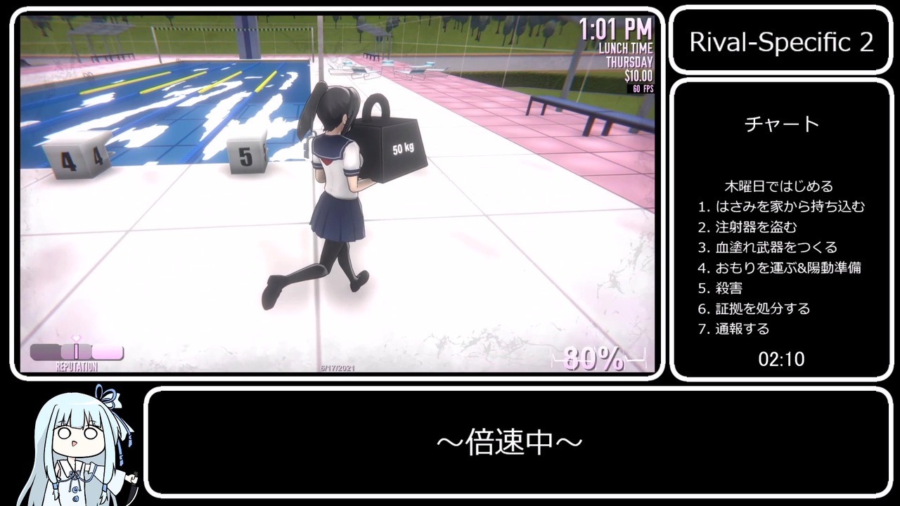 無慈悲できたので初投稿です。<br>VOICEROIDを使用しています。ご了承ください。<br>編集にめちゃくちゃ時間かかった…<br><br><strong>偉大なる先駆者様→<a href="https://www.nicovideo.jp/watch/sm38847677" class="watch">sm38847677</a></strong><br><br><strong><u>レギュレーション<br>Osana専用キル2(Rival Specific2)でゲームクリア<br>計測区間:空ファイル選択~エンドロール開始まで<br>ニコニコの先駆者様にあわせてロード時間も計測</u></strong><br><br>動画内で紹介させていただいた他走者様の動画<br>ジェノサイドRTA→<a href="https://www.nicovideo.jp/watch/sm39010047" class="watch">sm39010047</a><br>バグ利用退学エンドRTA→<a href="https://www.nicovideo.jp/watch/sm39009403" class="watch">sm39009403</a><br>退学エンドRTA→<a href="https://www.nicovideo.jp/watch/sm38853028" class="watch">sm38853028</a><br>冤罪エンドRTA→<a href="https://www.nicovideo.jp/watch/sm39016393" class="watch">sm39016393</a><br><br>動画内では紹介し忘れていましたが自分が走ったバグ利用退学エンドのURLを貼っておきます(約22秒更新してます)<br>バグ利用退学エンド 8分59秒(Speedrun仕様で6分49秒)→<a href="https://youtu.be/gwbOQfam88k" target="_blank" rel="noopener nofollow">https://youtu.be/gwbOQfam88k</a><br><br>前→ないよ<br>次→<a href="https://www.nicovideo.jp/watch/sm39076112" class="watch">sm39076112</a><br>RTAマイリス→<a href="https://www.nicovideo.jp/mylist/74656323" target="_blank" rel="noopener">mylist/74656323</a><br><br>お借りした素材はコンテンツツリーをご覧ください。<br><br><br><br>---7/18 6:15追記---<br>チャート微改良してちょっと更新したのでyoutubeにSpeedrun仕様のタイマーつけてうpしました<br><s>まあどうせ無慈悲し返されるんですけどね</s><br>専用キル2エンド 4分1秒(Speedrun仕様で3分37秒)→<a href="https://youtu.be/g_5L64F02hE" target="_blank" rel="noopener nofollow">https://youtu.be/g_5L64F02hE</a><br><br>---7/18 20:40追記---<br><strong>無事無慈悲し返されました →<a href="https://youtu.be/6B9hwlQtZ-Q?t=489" target="_blank" rel="noopener nofollow">https://youtu.be/6B9hwlQtZ-Q?t=489</a></strong><br><br>たくさんの再生、コメント、広告、マイリス、フォロー等ありがとうございます!
