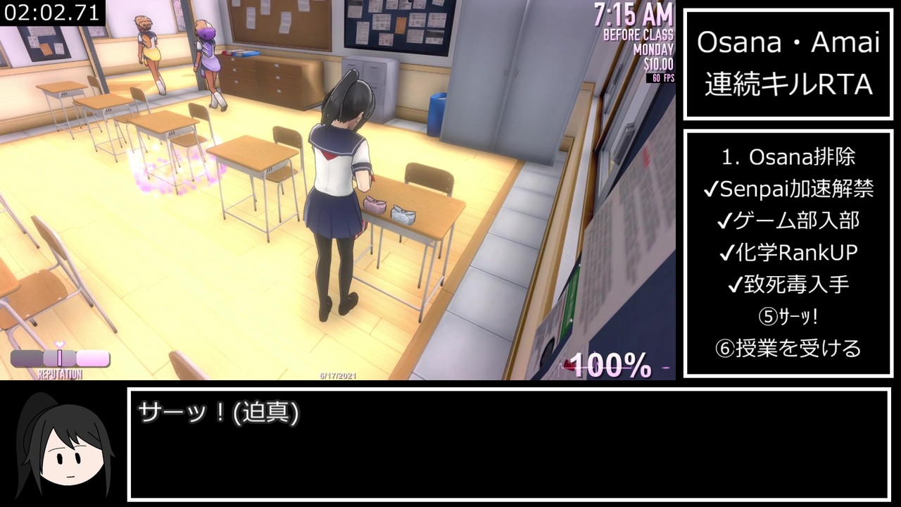 空前のヤンシミュブームに乗りたかったので初投稿です。<br><br>ないよ←前回<<a href="https://www.nicovideo.jp/mylist/71414199" target="_blank" rel="noopener">mylist/71414199</a>>次回→<a href="https://www.nicovideo.jp/watch/sm39073935" class="watch">sm39073935</a><br><br><u>レギュレーション</u><br><strong><u>詳しくは提唱者兄貴の動画を参照</u></strong>→<a href="https://www.nicovideo.jp/watch/sm39036354" class="watch">sm39036354</a><br><strong><u>Osanaを毒殺で排除、Amaiを物理殺害で排除</u></strong><br><u>計測区間</u><br><strong><u>新規ファイル選択~Amai殺害後の日付画面まで<br>ロード時間も計測</u></strong><br><br>Amaiちゃんの排除にあたって、<s>ドスケベテロリスト</s>にんどう兄貴の撲殺チャートを参考にさせていただきました。<br>参考動画→<a href="https://www.nicovideo.jp/watch/sm39038328" class="watch">sm39038328</a><br><br>左下のYan-chanはGIMPで4545ベジェ曲線いじくり回して描きました。<br>今の所普通顔とthinking face差分しかないけど需要があれば配布します。