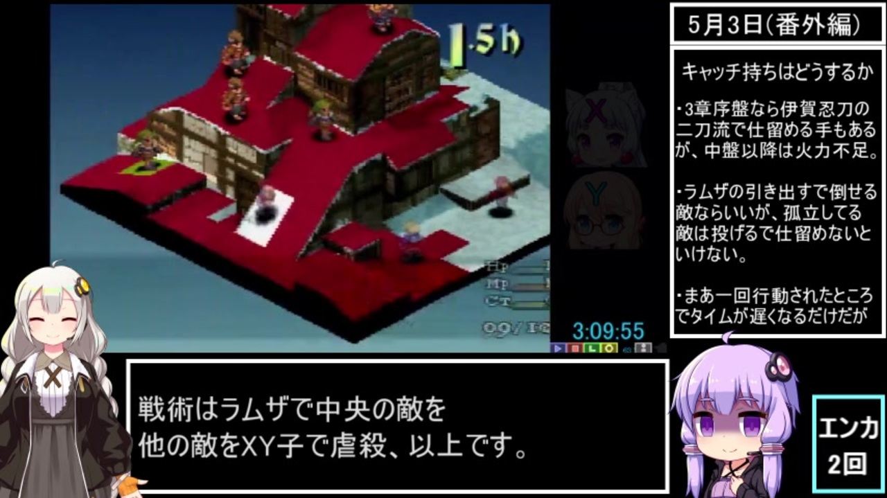 4章になってからのリセット後のエンカ率増大現象については<br>FFTプレイヤーは「何かよくエンカ引くなあ」ぐらいには感じてても<br>ハッキリと「バグがあるのでは?」とまでは行き着かなかったのでは<br>ないかと思います、ハッキリおかしいという所まで気づけたのは<br>RTAやってるからこそですね。<br>あと右枠にも書いてる通り、バグの原因はランダムバトルの種類が<br>4章から増え、スペシャルバトルも加わることだと思われます。<br><br>追記:コメントで「リセ後に状況再現操作しちゃってるのでは?」<br>とありますが、私はちゃーんと毎度タイミングをズラしてから<br>行先決定してますよ、当たり前だよなあ?<br>それで引きまくるから困ってるんですよ…<br><br>次回(後編)→<a href="https://www.nicovideo.jp/watch/sm39138674" class="watch">sm39138674</a><br>前回→<a href="https://www.nicovideo.jp/watch/sm39000478" class="watch">sm39000478</a><br><br>本RTAのマイリスト→<a href="https://www.nicovideo.jp/mylist/69593233" target="_blank" rel="noopener">mylist/69593233</a><br>過去作投稿一覧→<a href="https://www.nicovideo.jp/mylist/63487603" target="_blank" rel="noopener">mylist/63487603</a><br>ニコ生RTAコミュニティ→co3832963